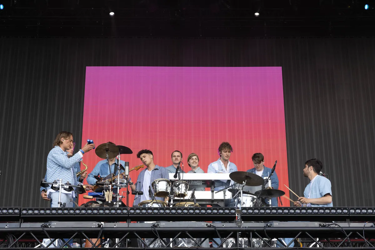Zes bonzende hartjes op de rand van het podium. Zo begint het optreden van L’Imperatrice. De Franse discoband heeft in Nederland nooit een radiohit gehad, maar aan het aantal meezingers te zien luistert een hoop mensen tijdens het werk naar FIP Radio. De band begint subtiel, met woozy discopop, die opvallend veel rust op synths. Je hoort in hun geluid discomeester Cerrone natuurlijk, en door die synth bass ook Imagination, allebei Frans discogoud.