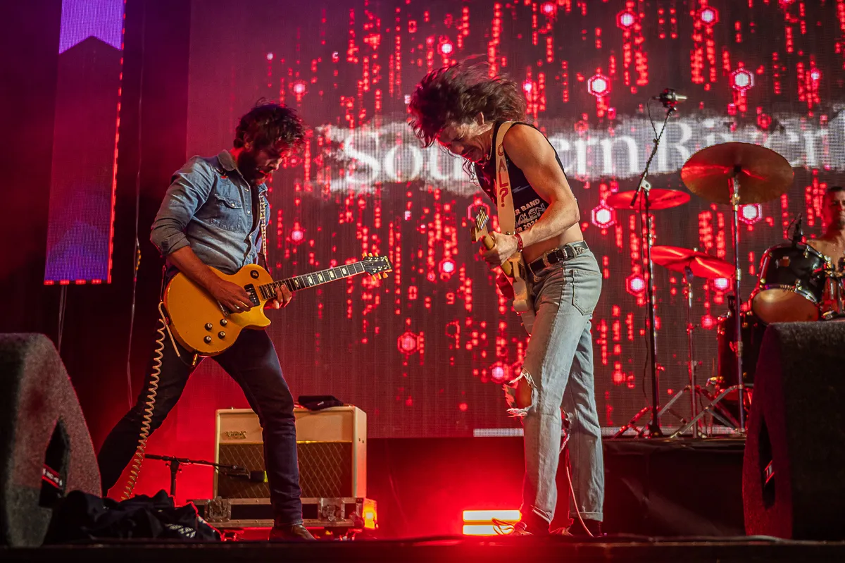 Is dat Eddie van Halen op het podium? Nee, veeg het festivalstof uit je ogen… Het is The Southern River Band! Dit rock ’n’ roll hairmetal viertal uit West-Australië, zwaar leunend op AC/DC en Status Quo, maakt hun reputatie als live-sensatie Down Under meer dan waar. De zanger zwiept zijn wilde manen, slaat een fles rode wijn achterover en vertelt verhalen over vrienden die crystal meth verkopen. In het publiek gaan constant rockhandjes de lucht in en crowdsurfers stromen langs. De hijgende frontman roept uit: ‘It’s like I ran a fucking marathon, give me two seconds!’
