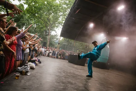 Wie ooit een aflevering van Dog Whisperer heeft gezien, weet: als je een hond wil trainen, moet je direct en met autoriteit spreken. En dat doet hij. Op twee nummers na schreeuwt hij álles vanaf de barricade het publiek in. ‘Go and fuck yourself!’ brult hij recht in het gezicht van een vrouw op leeftijd. Intussen zie je de saxofoniste moeite doen haar gezicht in de plooi te houden, terwijl ze de zoveelste waanzin live moet begeleiden.