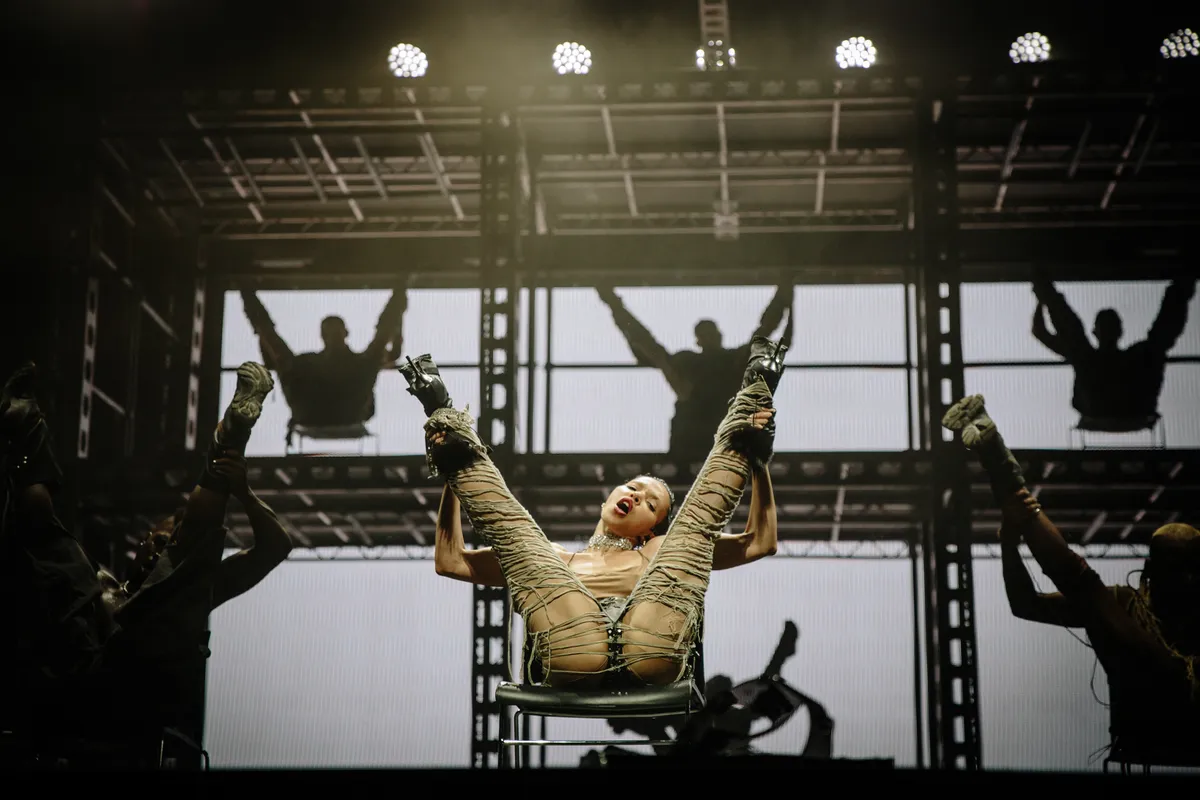 Godzijdank staat ze nu wel hier voor een kunstzinnig popspektakel dat zijn gelijke niet kent, en toch niet topzwaar wordt. twigs staat met pretoogjes tussen de dansers waar de euforie vanaf spat, vliegt over de paaldanspaal, laat zich via de stellages naar beneden zakken. Soms zingt ze niet live, maar de performance en dans zijn net zo essentieel voor deze show. Bij ‘Two Weeks’ verschijnt een doodenge, zeker tien meter breed, gevleugeld monster dat ingenieus door de dansers tot leven wordt geblazen. Bij andere artiesten was dit hét special effect dat twintig minuten wordt uitgemolken, hier is het slechts een van de vele wonderschone trucs, het duurt zelfs maar twee minuutjes. Vanuit de high en extase van de rave komt ze via de comedown van drie heerlijke CAPRISONGS-liedjes en het Madonna-esque ‘Feels So Good’ uiteindelijk bij het verdriet van ‘cellophane’: in haar eentje begeleid door slechts een piano schiet haar stem de ijlste hoogtes in, en dwingt ze een indrukwekkende stilte af. In een tent voor dik 10.000 mensen. Om 23.30u ’s nachts. Overal natte oogjes, ontroerde gezichten, mensen die niet meer weten wat ze met hun emoties aanmoeten en na een ugly-cry door vreemden worden omhelst. Wauw. We waren hier toeschouwer van iets heel bijzonders.