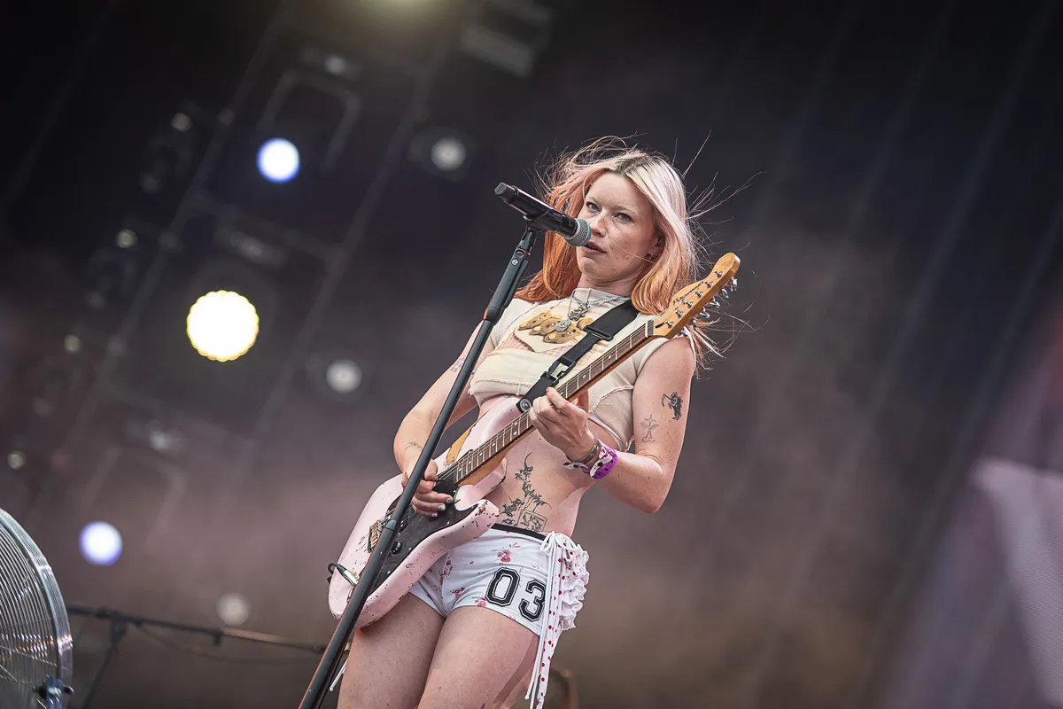 Sapperedosio, in aanloop naar album twee is Wet Leg van een band nu een ACT geworden. Met een look: Rhian Teasdale is een heuse muscle mommy. Met een windmachine ook, die haar haren nog eens extra laten wapperen. Met on stage een rood telefoontje als stageprop. En met poses: telkens weer flext Teasdale haar dikke biceps en triceps in openingsnummer ‘catch these fists’, over vervelende gasten die zich aan je opdringen en denken je zo te kunnen versieren. Teasdale heeft het enige juiste antwoord: klap op je kanus kun je krijgen! ‘Wet Dream’ en ‘Chaise Longue’ (met slappe lach gebracht door de rowboat sitdown en de crowdsurfer op een opblaasbootje) scoren een dikke 10 op de schaal van indie anthem, maar ze spelen ook iets teveel krappe zesjes voor zo’n belangrijke mainstage-show.