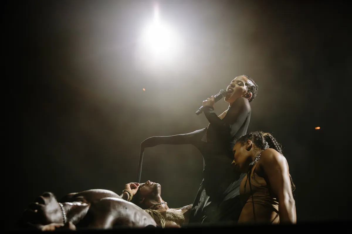 Voel je dat? Die tinteling in de toppen van je vingers? Dat gekriebel op dat ene plekje op je slaap, dat echt veeeeeeel te goed voelt? De onweerstaanbare drang om zachtjes je eigen bovenbeen te strelen? Zij voelen het wel, hoor. Die ene guy staat met het shirt over z’n koppie getrokken keihard te dansen op een kick die in zijn hoofd eindeloos doorgaat, maar in werkelijkheid al lang is gestopt. Ondertussen zitten de andere dansers van FKA twigs met elkaar te knuffelvrijen alsof hun lichamen zijn versmolten tot één sensueel wezen met één hartslag. twigs zelf gaat uitgeput en voldaan op een stoel zitten, laat een onhoorbare extatische zucht, een klein glimlachje om haar mond. Dit gevoel is dus EUSEXUA, het meesterlijke album dat werd geboren na een nacht doorhalen op een illegale rave in Praag. Een sensationele show, die godzijdank alle problemen heeft overleefd: twigs moest de streep zetten door de ene na de andere datum, cancelde zelfs de hele Amerikaanse tour inclusief Coachella wegens allerlei productionele tegenslagen. Ze moet er tonnen op hebben verloren.