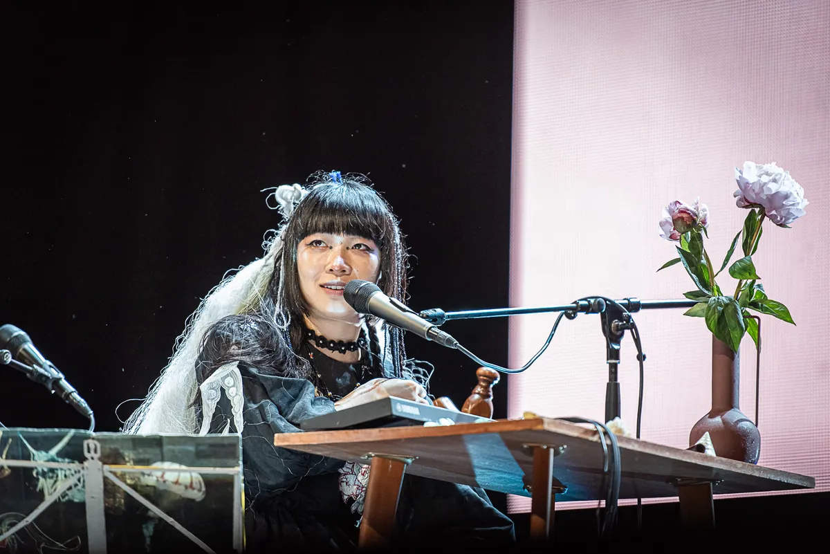 De Japanse singer-songwriter Ichiko Aoba heeft de energie van een mystieke beschermengel die op een vroege zondagmiddag alle chaos en prikkels van het weekend wegvaagt. In een lange zwarte jurk en met haar witte haardos als een sluier neemt ze plaats achter een tafeltje met een vaasje bloemen — alsof ze er al de hele ochtend op je zat te wachten. Wat volgt, voelt als het openen van een verborgen deur naar een andere wereld.