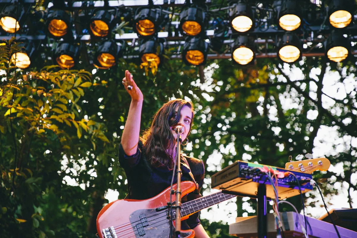 En dan heeft Jobse nóg een stage opgebouwd: Strangelove 2 moest volgens Job ‘atmosferisch’ worden, met een gigantisch grid aan lampen dat losjes geïnspireerd is door het stage design van Kanye West. Elias Mazian, Fenna Fiction en Luc Mast draaien er een fonkelende beatloze klarinetplaat voordat Oceanic een zeldzame liveset doet. Het klinkt als Four Tet op z’n meest introvert, soms met een korasample en percussieve belletjes, dan weer met barokke orgelakkoorden of gamelandrones. Heel erg mooi. Ook fijn: het concert van Eefje de Visser daarna. De zangeres is zichzelf opnieuw aan het uitvinden als soloact (waarmee ze ook al op Wildeburg en de X-Ray van Lowlands speelde) en is vandaag snotverkouden, vertelt ze met een diepe stem. Zodra ze begint te spelen hoor je daar niets meer van. Behendig switcht ze van bas naar toetsen naar gitaar terwijl ze haar cryptische teksten naar buiten laat fladderen. ‘Er zit een vreemde in mijn hoofd nu’, zingt ze. Er zijn vrouwen vooraan die het keihard meezingen, maar ook jongens die het gevoel net iets te goed herkennen en met wegdraaiende ogen staan te swingen. Dan blijkt ook dat de muziek van Eefje met drumcomputer en synths iets meer op de heupen werkt en iets minder op het hart.