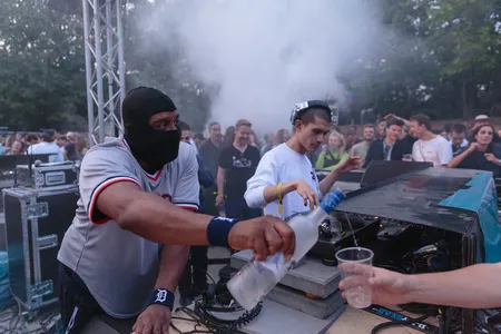 Verder zijn het vooral de vele magische back to back-sets die bijblijven: SPIELRAUM-residenten KI/KI en Afra openen de kuil verrassend stevig (‘Kernkraft 400’ én ‘I Wanna Go Bang’!) en zien ‘m helemaal volstromen, Lena Willikens en Philip Jondo kietelen even verderop met experimentelere struikelhouse en ook Objekt en DJ Stingray blijken een gouden huwelijk. Ze plakken allerlei doorjakkerende electroplaten aan elkaar met de vingervlugheid van hiphop-dj’s, Stingray mixt er af en toe een blaffende hond doorheen en wanneer Objekt het overneemt, trakteert de reus uit Detroit de eerste rij op glaasjes wodka. En dan schuift hij zijn iconische bivakmuts omhoog om de fles zelf aan de mond te zetten.