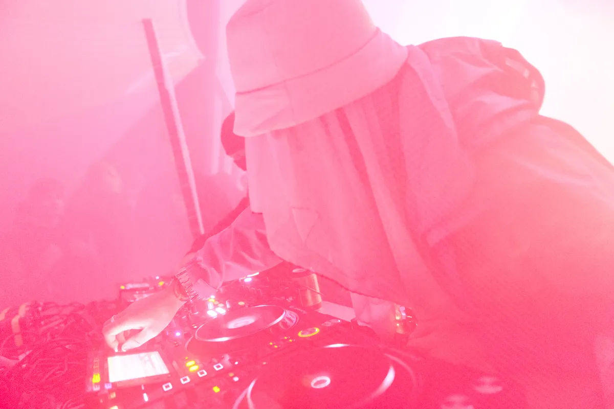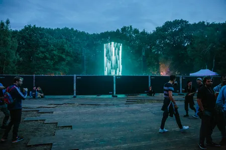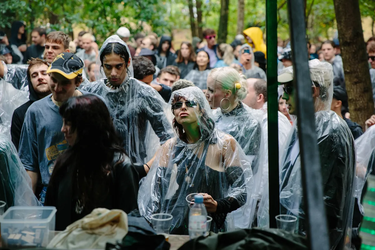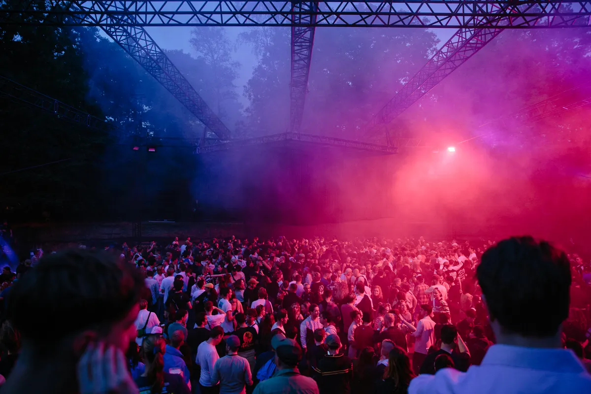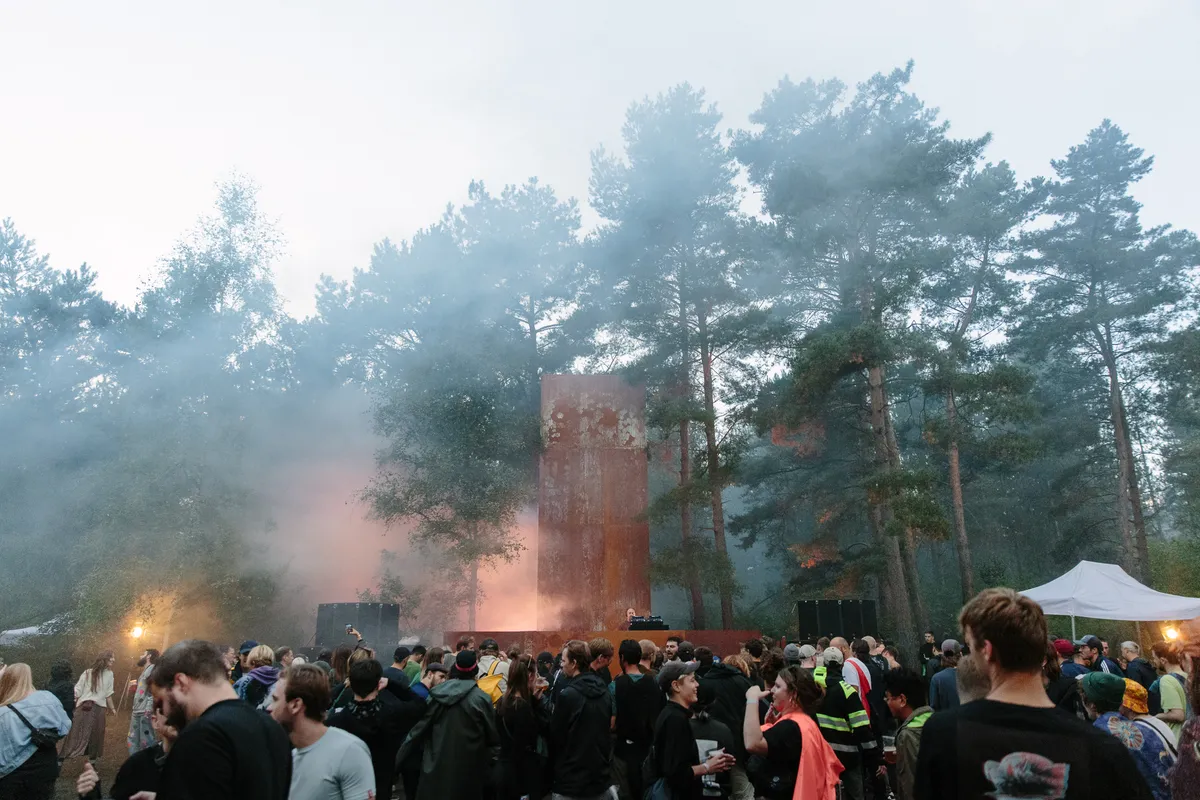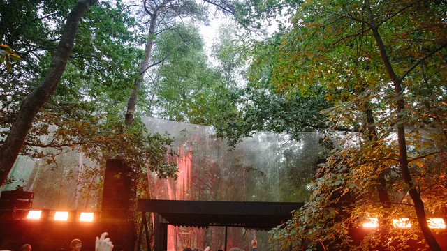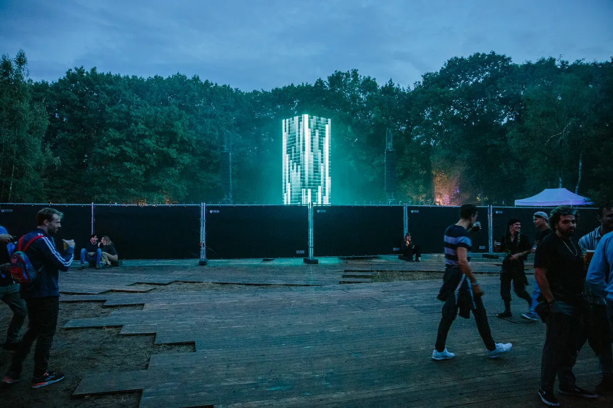 Wow. Zie je dat? Hoe de doorschijnende, meterslange, lichtroze lakens worden gegrepen door de wind en zachtjes heen en weer wapperen? Ze hangen hoog in de bomen, en naarmate de avond valt veranderen ze in een glinsterende groep spoken, een lichtdesign zoals je dat nog nooit hebt gezien op een dancefestival. Het is werkelijk magnifiek. Daartussen staat een minuscuul podiumpje gebouwd, maar eerlijk, het voelt alsof we hier met zijn honderden op de allersickste illegale bosrave staan te dansen, diep in het Tilburgse MOB-Complex.