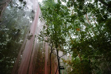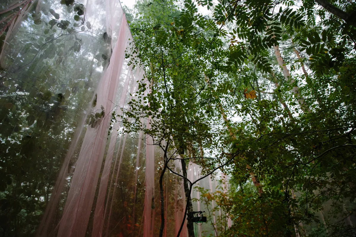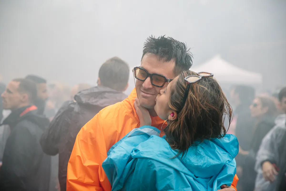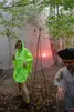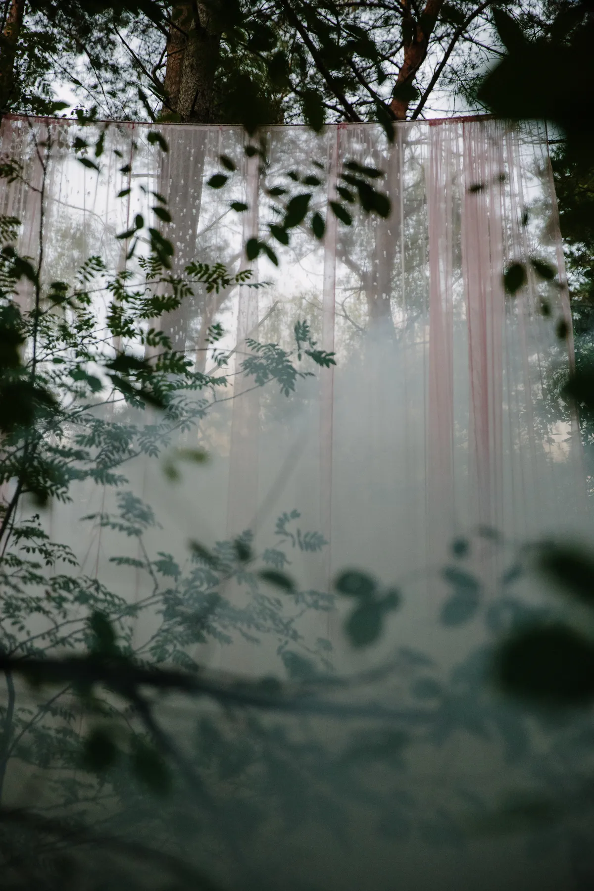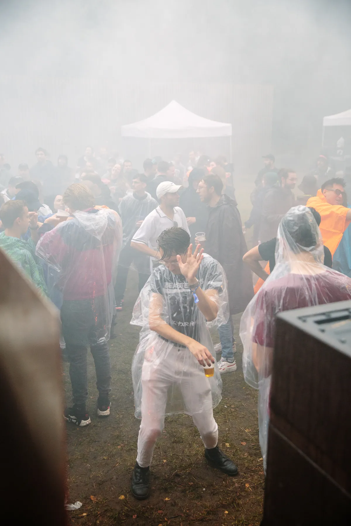 Wow. Zie je dat? Hoe de doorschijnende, meterslange, lichtroze lakens worden gegrepen door de wind en zachtjes heen en weer wapperen? Ze hangen hoog in de bomen, en naarmate de avond valt veranderen ze in een glinsterende groep spoken, een lichtdesign zoals je dat nog nooit hebt gezien op een dancefestival. Het is werkelijk magnifiek. Daartussen staat een minuscuul podiumpje gebouwd, maar eerlijk, het voelt alsof we hier met zijn honderden op de allersickste illegale bosrave staan te dansen, diep in het Tilburgse MOB-Complex.
