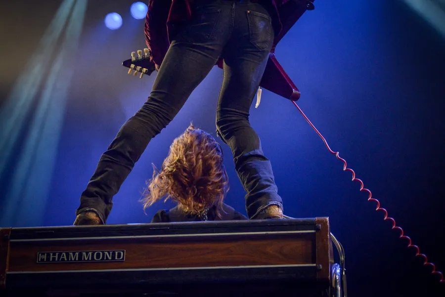 Bijna een halfuur is DeWolff al bezig. De haren zijn gezwiept, Robin Piso is al tig keer opgestaan achter zijn Hammond orgel, om er met de ellebogen weer op te belanden. Pablo is er al bovenop geklommen, bij het tweede nummer al, een vinger naar de nok van de tent, het snoer van zijn gitaar krullend naar beneden. En toch is het niet gelukt om een fatsoenlijk nummer te ontdekken. Dat is het grote probleem van DeWolff: die jongens kunnen pingelen als een dolle - echt, bijna niemand hier doet ze dat na - maar memorabele liedjes wil het in al die jaren maar niet opleveren. Nou ja, oudje 'Don't You Go Up The Sky' is wel ok, met een orgelhook die wel blijft hangen. Hoe virtuoos de jongens ook spelen, pas bij het zesde nummer komt er serieuze energie vrij.