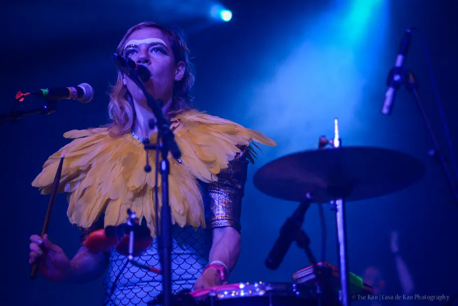 Op Eurosonic en London Calling dit jaar waren ze nog met z'n tweeën, maar vandaag betreedt Kid Karate het podium als drietal. In de clubscene in Dublin werken de jongens regelmatig samen met leden van Kodaline, Overhead en The Albatross. Zelf brengen ze noisy rock met loopstations, samplers en synths waarmee ze sinds kort ook buiten de kleine clubs en festivals treden. Toch blijft het oefenhokgehalte hoog. Neem bijvoorbeeld 'Night Terrors'. We kunnen slechts gissen wat voor nachtmerries zanger/gitarist Kevin Breen heeft, maar een optreden als dit zou er best een kunnen zijn. Deze frontman is namelijk alles behalve smooth. Zo wordt een van zijn falende pogingen om de nummers aan elkaar te praten behulpzaam beëindigd door een inzet van de drummer, wiens bassdrum later tijdens het nummer stuk blijkt en vervangen moet worden. Ondertussen is de zanger alweer de fotopit in gedoken, waar slechts een handjevol mensen aan het hek zijn high five beantwoordt. Tijdens de afsluiter doet hij opnieuw een dappere poging die start met een onhandige val van het podium waarna Breen als een dolle puppy het publiek door rent. Sympathiek zijn ze zeker en op hun eigen manier aanstekelijk, maar om echt te overtuigen moet Kid Karate nog even aan zijn skills werken. (Imke Loeffen)
