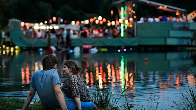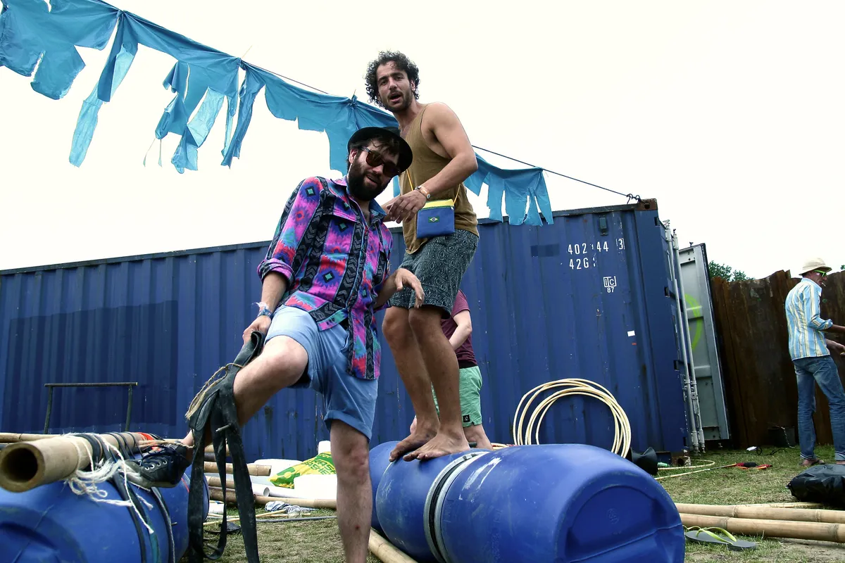 Een groot succes overgehouden aan vorig jaar: vlotten bouwen op Watership Down. Het enige wat je nodig hebt: pallets, touw en regentonnen. En dan maar hopen dat je blijft drijven. Voor kunstenaar Jordan (36) en Joost (26) een eitje. Ze zijn in het dagelijks leven beeldend kunstenaars waarbij dezelfde overeenkomst geldt: van niets iets maken, aldus Jordan.