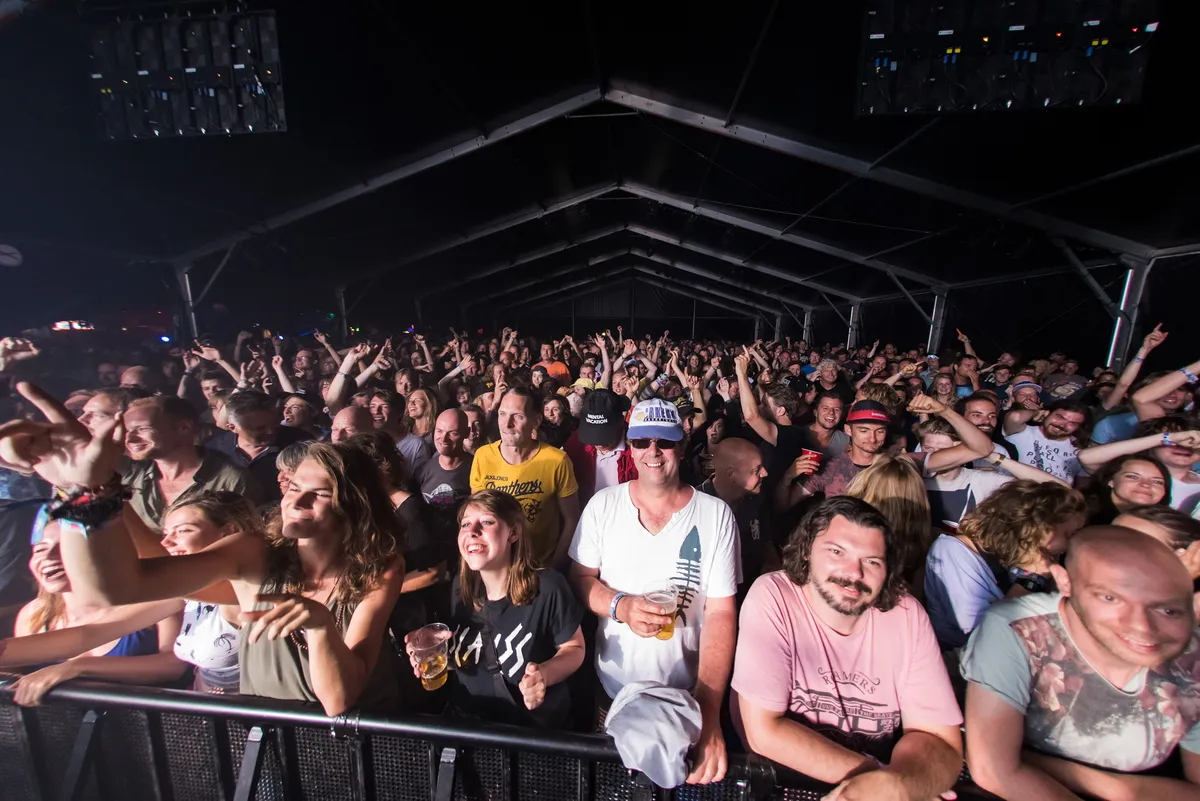 Tijdens de introtune worden het volume en de basdrum al hard opengedraaid. De keuze: ‘We Like To Party (The Vengabus).’ Het publiek weet waar ’t aan toe is en springt op de krakende houten vloer. Slaves speelt tegelijk met headliner Moderat. Wie bij Slaves staat, gaat er helemaal voor.