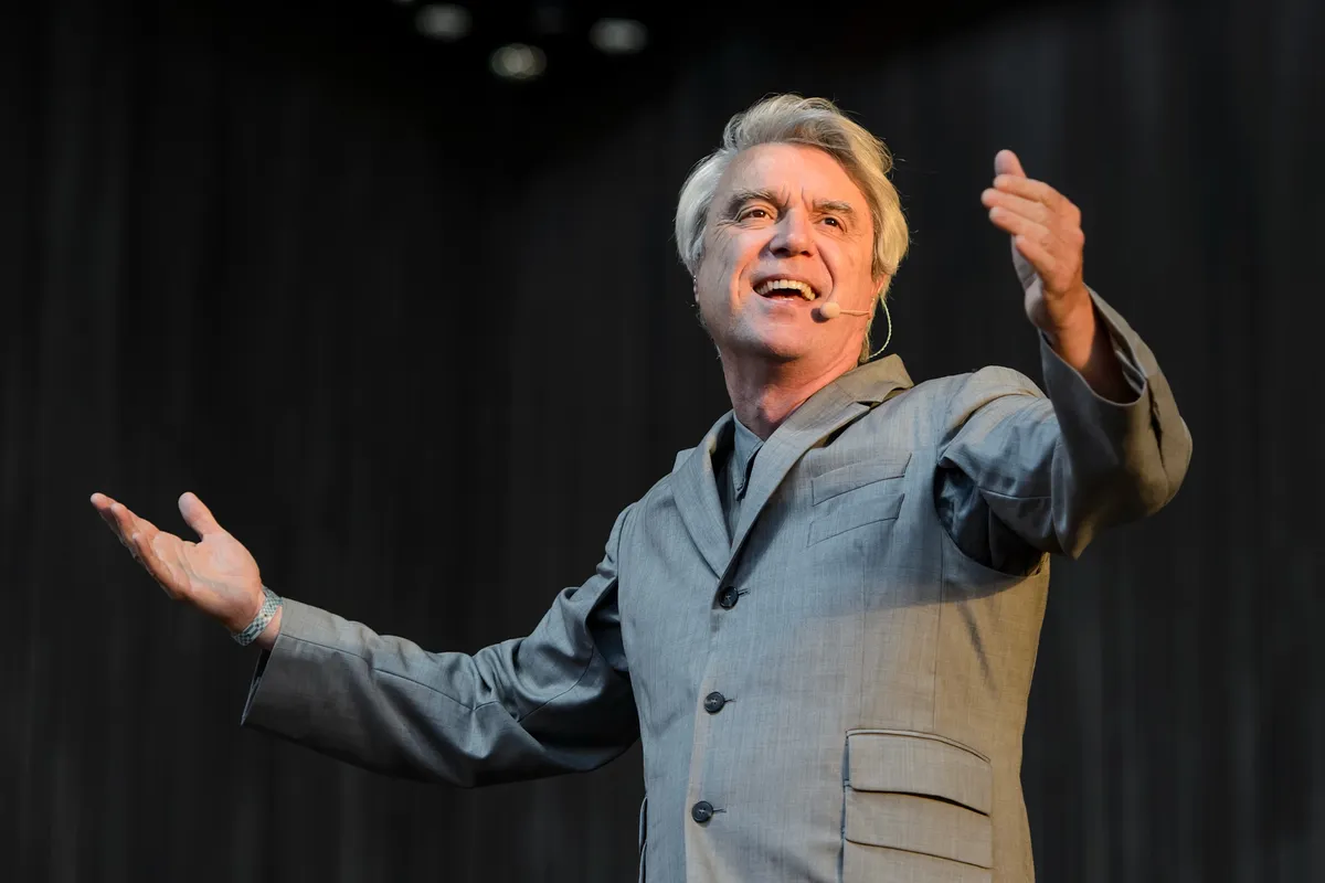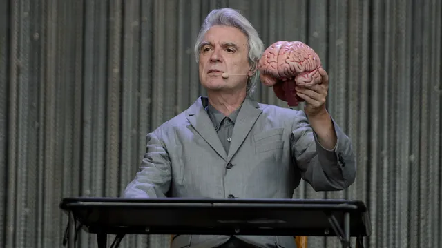 Het begin: David Byrne met een stel hersenen. Hij wijst: hier is de plek waar overbodige details opgeslagen worden, hier wordt van alle geluiden die binnen komen chocola gemaakt. Hij is alleen, in een grote grijze doos, in een grijs maatpak, op blote voeten. Dan stappen uit de coulissen muzikanten. Mannen, vrouwen, wit en zwart. Sommigen dragen delen van een drumstel, samen klinken ze als een eenheid. Langzaam komt het besef. Dit is niet zomaar een oude held, dit wordt een van de allerbeste shows van het weekend.