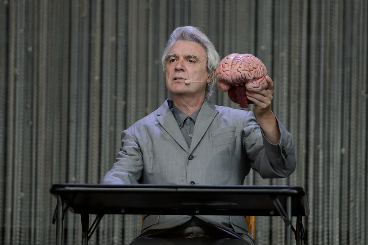 We zijn zo jaloers op het brein van David Byrne. Hij wijst eens aan hoe het werkt, dat brein van hem: hier is de plek waar overbodige details opgeslagen worden, hier wordt van alle geluiden die binnen komen chocola gemaakt. Hij is alleen, in een grote grijze doos, in een grijs maatpak, op blote voeten. Wat een bijzonder begin van de show van Byrne. Hij was altijd al een visionair die bijzonder goed nadacht hoe je popmuziek presenteert, ook in de jaren zeventig met Talking Heads en onlangs nog tijdens zijn tour met St. Vincent. En nu, op zijn 66-ste geeft hij zowaar de meest cerebrale show uit zijn carrière, naar eigen zeggen de meest ambitieuze sinds de legendarische Stop Making Sense-tour.