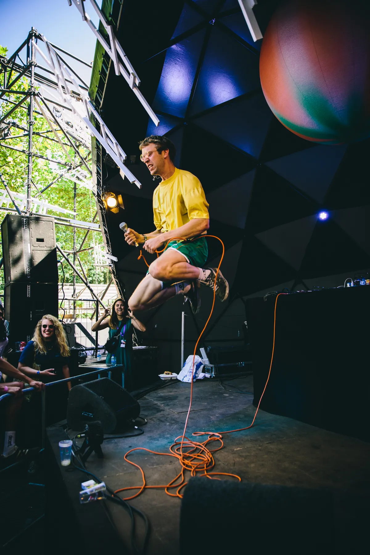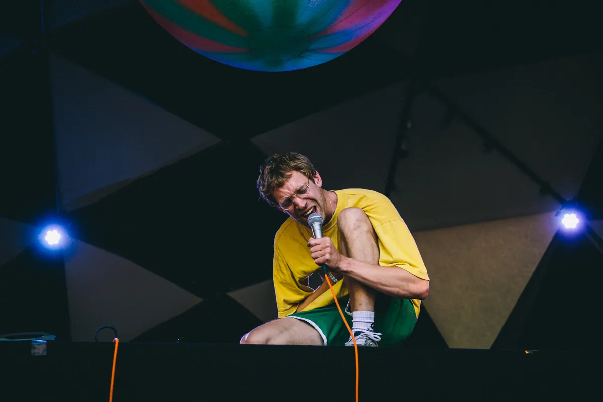 Denk John Maus voordat hij een band om zich heen verzamelde, met vrolijke synthpoptunes die hij op zijn iPhone aan zet, een tikkeltje minder manisch en nog veel opgewekter. ‘AAAAAAAAAH!!!!,’ kirt hij. ‘AAAAHAHAAAH!’ Iedereen roept met ‘m mee. Hoe je precies op zijn tunes moet springen? In zijn groene sportbroekje doet hij het vast voor. Hoppa, indrukwekkend de knieën de lucht in getrokken. En nog eens. En nog eens. Hij doet het zo wonderschoon en energiek dat je direct met hem mee wilt doen. Als hij ermee wegkomt zonder eruit te zien als een complete debiel, dan kun jij dat ook, toch? Al gauw klautert hij op zijn tafel, in de speakers, op de hekken en in alles waar hij maar in kan klauteren.