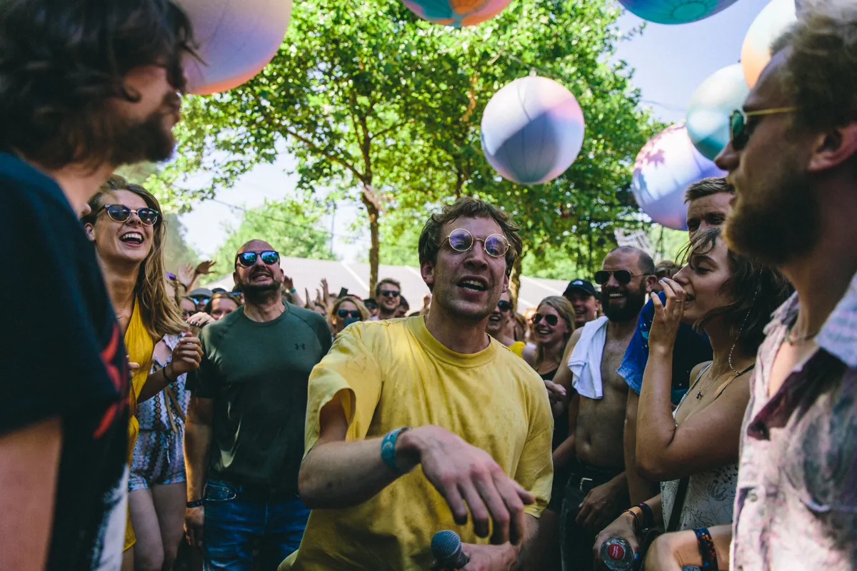 Stel je het allerleukste huisfeestje voor waar je ooit bent geweest. Nee, nog leuker. Nee, nóg leuker. Zo’n feestje waarbij je beste vrienden op de tafel springen, jij van vreugde een koprol doet over de vieze vloer (dat leek toen een goed idee) en vervolgens je telefoon kwijtraakt. Om hem twee dagen later terug te vinden in de koelkast. Dat huisfeestje heet voortaan Karel. De hipste vrienden van jouw hipste vrienden kennen Karel al uit het Subbacultcha-wereldje, dit najaar belooft hij de grote sensatie te worden op de Popronde, en hier staat hij om kwart over drie ’s middags op het kneuterige Future Fuzzy Field al compleet uit zijn plaat te gaan.