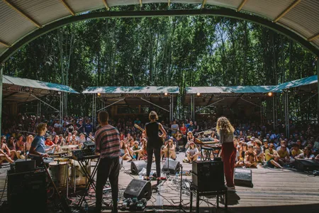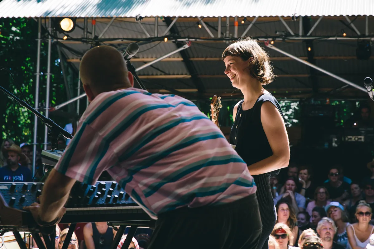 Al snel blijkt van wel. Die zachte grooves laten zich moeiteloos opwarmen, en krijgen de ruimte om langer op te bouwen en door te dansen. Soms een meeslepende roffel, ingetogen maar daarom juist retespannend. Of een puntige stilte middenin een liedje, om daarna meteen weer in die groove terug te vallen. LUWTEN laat precies op de juiste momenten los, om dan de stilte weer stevig vast te pakken. Het viertal op het podium kijkt elkaar breed lachend aan. Het publiek, dicht tegen elkaar geplakt op de banken tussen de bomen, wiegt zachtjes met de schouders heen en weer. Terwijl Tessa en haar bandleden hun glasheldere harmonieën zingen, vliegen de bellenblaasbellen door de lucht. Down The Rabbit Hole houdt van gekte, maar soms zit de magie juist in deze kleine idyllische hoekjes.