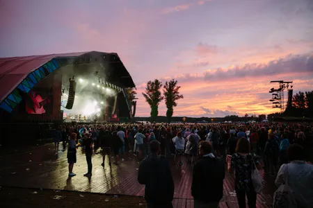 Kijk, links naast het podium straalt daar een prachtige regenboog. Rechts naast het podium kleurt de lucht roze en vuurrood van de ondergaande zon. En het veld? Dat verandert in goud. De meest vreugdevolle show van het weekend krijgt ook de meest vreugdevolle omlijsting. Prachtig.
