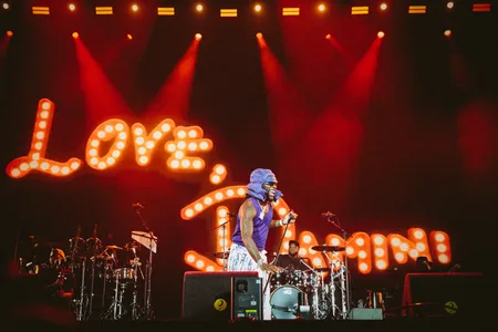 Daarmee is de scepsis die nu hier aan de Groene Heuvels heerst wel weer begrijpelijk, maar kijk eens aan, Burna Boy is keurig op tijd, in een blauw stekelig powerranger meets Pino-pak. En vanaf de eerste seconde is duidelijk: deze man heeft Star Power. Star Power in overvloed. Hij hoeft zijn zonnebrilletje maar af te doen en gegil valt hem ten deel. Laat staan wanneer hij zijn shirt uittrekt! Hij zwiept zijn micstand heen en weer als een volleerd James Brown. Het is moeilijker om hem zonder big smile op de foto te zetten dan met. En hij speelt zijn solide afropop-oeuvre extatisch, met een enorme band. Links en rechts staan al een achttal extra zangers, een blik blazers, twee drummers, en alsof dat nog niet genoeg is wordt hij af en toe ook nog omringd door vier percussionisten.