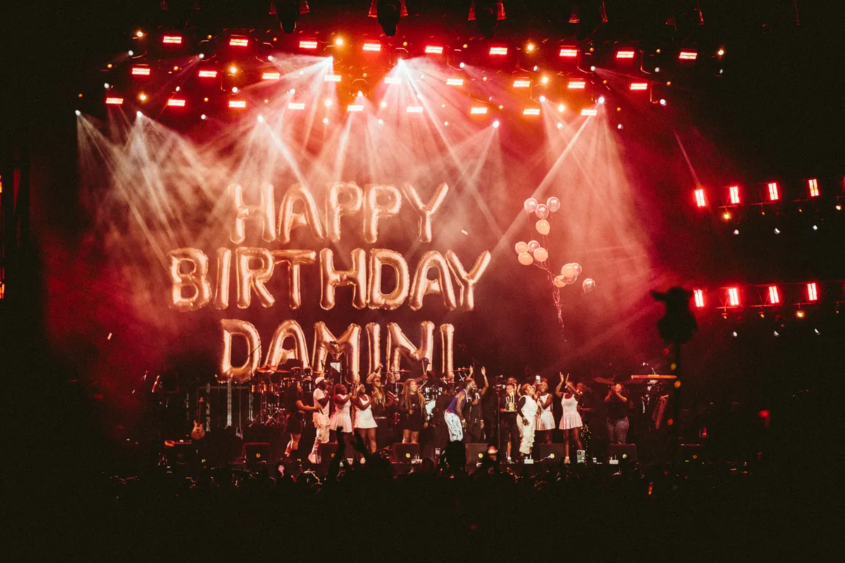 ‘Do you wanna know my secret? It’s my birthday’, verklapt Burna Boy al vroeg in de set. Dan landt zijn opmerking nog niet helemaal, maar stipt middernacht rukt opeens een enorme taart aan, en vliegen trossen ballonnen plots naar boven. Ja, écht, verzekerd een van zijn meegenomen zangers: Burna Boy mag vandaag 32 kaarsjes uitblazen. Te cute. Dus schieten sterrenregens uit plafond en de vloer tegelijkertijd, en die taart? Die belandt in het publiek.