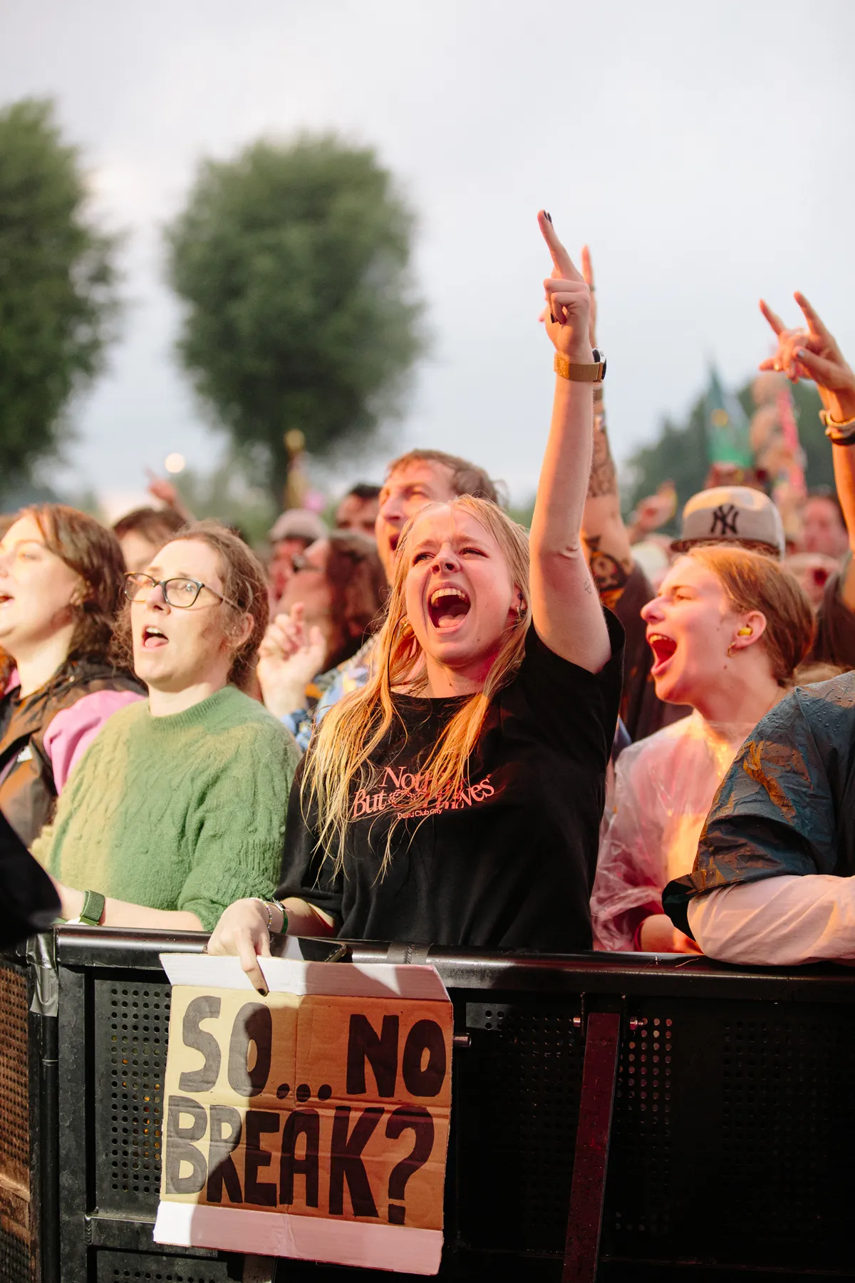 Technisch gezien is het een upgrade (waar Down The Rabbit Hole ongetwijfeld wat geld op heeft moeten toeleggen): Sam Fender deed afgelopen tour ‘slechts’ AFAS, Nothing But Thieves is van het formaatje Ziggo Dome, maar wij moesten wel een een traantje wegpinken: Sam Fender’s laatste plaat staat hier op repeat. Mason ziet er gelukkig uit alsof-ie nergens liever had willen zijn. ‘We were not supposed to be here. What the actual fuck!’, grinnikt hij. ‘We hadden nu thuis op de bank moeten zitten, maar we kunnen niet om jullie heen! Of eigenlijk andersom.’ Eén hele blije NBT-überfan heeft een lief kartonnen bordje gemaakt dat ze nu vrolijk omhoog houdt: 'So, no break?'