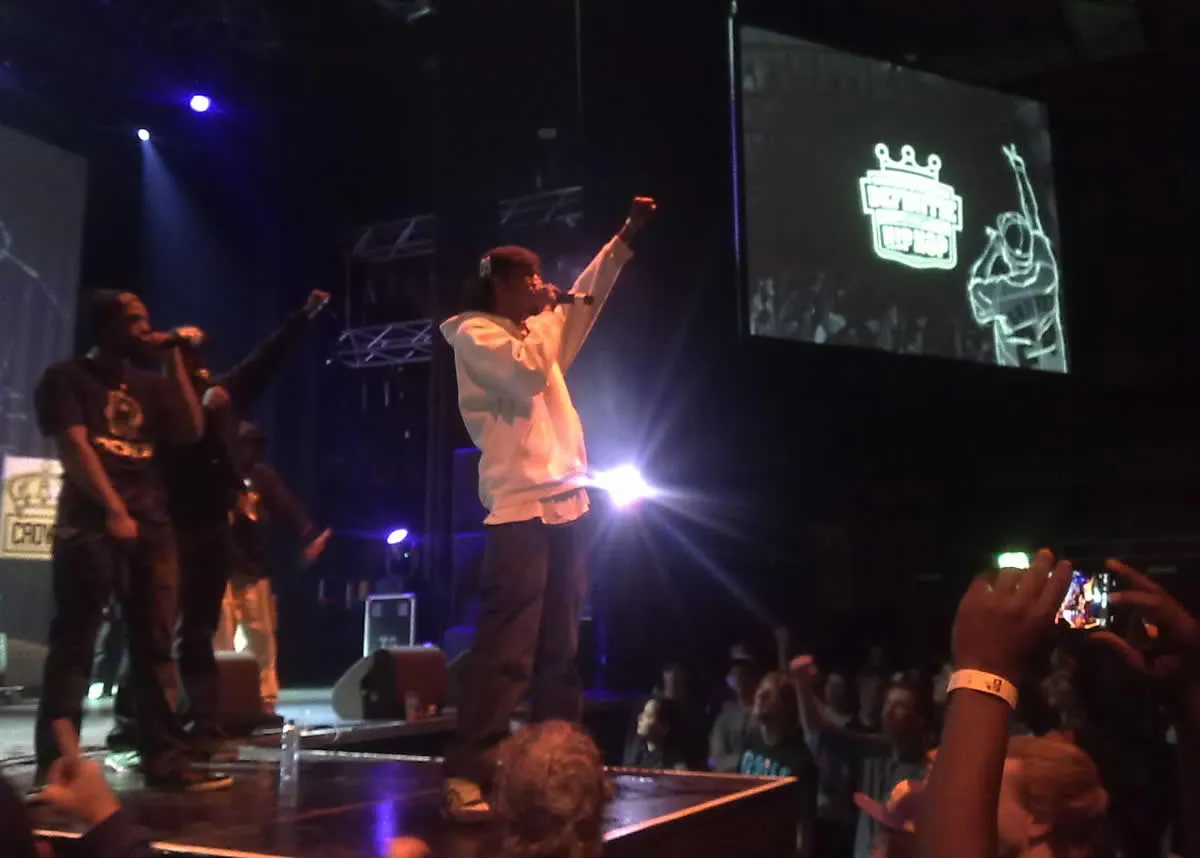 We missen helaas Bosschenaar Kleine Jay dus zien Fly-Bro als eerste in een nog vrij lege grote zaal aantreden. De crew uit Zuidoost stond vorig jaar nog in de Grote Prijs-finale en in 013 met een hele band op het podium.