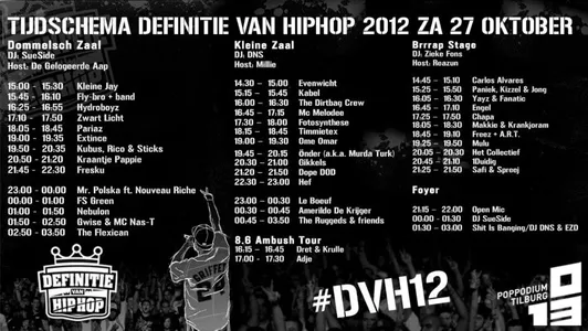 3voor12 belandde zaterdag spontaan op het grootste hiphopfestival van Nederland: Definitie van Hiphop met zo'n veertig optredens in alle zalen van 013, Tilburg. Definitie van Hiphop, tot 2 jaar terug nog Definitie van Dopeheid, geeft zaterdag een mooie dwarsdoorsnede van de Nederlandse hiphop in alle facetten: van oldschool boombap tot hitgevoelig tot harde rauwe hiphop van de straat, van hiphop-, tot grime-, Kubus- en Noisia-beats, voornamelijk Nederlandstalig maar ook een beetje Engels. En ook oervader Extince gaf weer eens acte de présence.