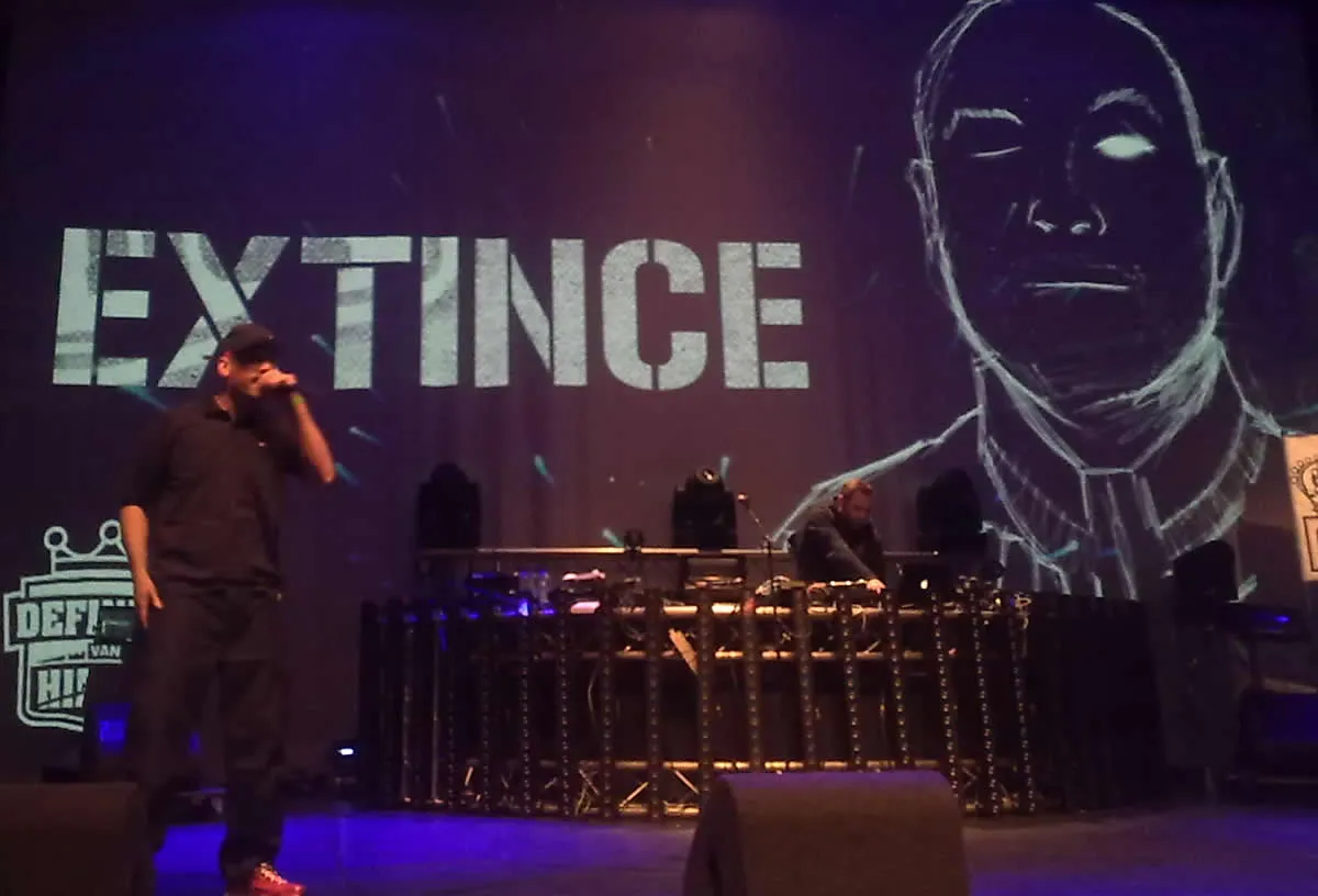 Uiteraard is Peter Kops aka Extince aka de Exter-o-Naldus een van de grondleggers van de Nederhop, een van de eerste kroonjuwelen van de Top Notch-stal en een levende raplegende. De Brabander is - ondanks zijn repertoire - ook een niet overdreven goede performer, die vanavond weinig klik lijkt te hebben met DJ DNS.