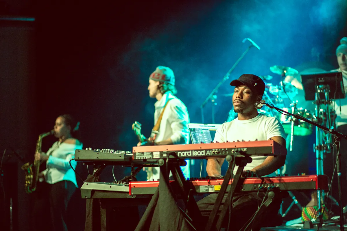 Dwarsfluit, check. Percussie met volledige uitrusting, check. Vocalist met dijk van een stem, check. Heb je effe? Sexy sax, stomende drums, 5-snarige killerbas én groovy gitaar, check. Met dit arsenaal trekt Bnnyhunna, die zelf 4 verschillende klavieren voor zijn rekening neemt, ten strijde om zijn materiaal tot leven te brengen. Zijn mix van jazz, soul, gospel, hiphop en highlife doet het ijskoude Groningen ontdooien. De showcase van de Amsterdamse producer en multi-instrumentalist start in kalme wateren, maar na een nummertje of 3 staat hij op van zijn stoel en zet de 7-koppige band een pulse van jewelste in, met vieze baslijntjes en zinderende synths. Veel stank faces zijn te spotten in het publiek en een enkeling schreeuwt goedkeurend ‘YEAH!’. De beste complimenten die je een musicus kunt geven. Bnnyhunna’s debuutalbum ECHOES OF PRAYER komt live ontzettend goed tot z’n recht met deze groep getalenteerde muzikanten. Het spelplezier spat ervan af. ‘HIT ME!’ schreeuwt Bnnyhunna à la James Brown om de groove verder in beweging te zetten. Als een echte dirigent lijmt Bnnyhunna het geheel met zijn toetsen aan elkaar.