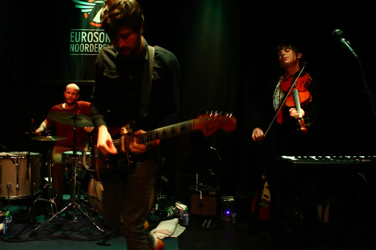 Balthazar werkt nooit met een vaste setlijst. Waar zij tijdens hun laatste albumpresentatie nog ‘gewoon’ met een paar nummers oud werk begonnen, zoeken zij vaak de balans op tussen hun twee platen. Vanavond heeft ´Rats´ de overhand: vijf van de acht nummers komen van de nieuwe langspeler. Het merendeel van de akoestische partijen wordt live ingevuld door Deprez’ elektrische gitaar, zoals bij het funky intro van ´Do Not Claim Them Anymore´. Het duo Devoldere/Deprez heeft, mede door hun harmonieuze samenzang, een sterke chemie. Vol zelfvertrouwen en kalm staart Devoldere de zaal in terwijl hij zijn zangpartijen droog mijmert. Deprez daarentegen zorgt voor een continue dreiging door veel ruis en explosies te creëren op zijn gitaar, waarbij hij zijn instrument de lucht in steekt en langs zich heen zwengelt. De manier waarop zij zingen, zich verplaatsen en van instrument wisselen komt op het oog wat nonchalant over, maar vergis je niet: de bandleden weten goed wat ze doen en handelen en musiceren vaak net een beetje anders dan we gewend zijn bij poprockbandjes. Patricia Vanneste tilt daarbij de intensiteit van de liedjes geregeld naar een hoger niveau met haar vioolspel en Christophe Claeys speelt complexe en beheerste drumpartijtjes. Als Balthazar tijdens ´Blood Like Wine´ hun instrument laat voor wat het is en enkel nog de slotzin ‘Raise your glass to the nighttime and the ways / to choose the mood and have it replaced’ als een mantra aanhoudt krijgt de band de zaal even stil.