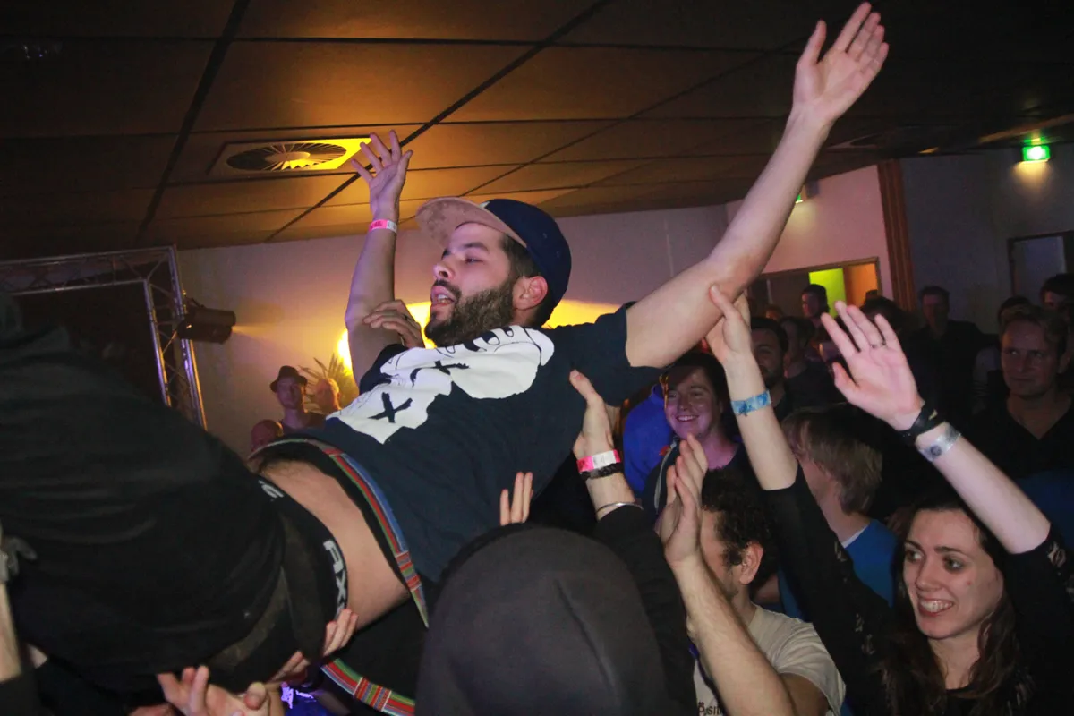 Die teksten gaan bijvoorbeeld over helikopters die boven ons hoofd cirkelen, oftewel de overheid die met zijn bemoei- en bespiedzucht elke keer weer met zijn hand in onze zak zit. Fokking maatschappijkritiek ja, maar dan wel met duizend knipogen. Het begint meteen goed met maatje Ome Omar op het podium. Hij doet een stagedive op de drie jongens vooraan, die netjes de tijd krijgen om hun biertje op de rand te deponeren. Dom Gedrag wordt luidt mee geschreeuwd: "Wat een idioot, als het even uitkomt vul ik zijn hoofd met lood!") Er zit een nieuw soort rebellie in deze eigenwijze zelfingenomen kwajongens. Een soort jonge-honden enthousiasme dat ook echt ergens over gaat. Stel jezelf de vraag waarom we doen wat we doen, waarom we pikken wat we pikken. Vergeet het ook meteen maar weer, want er beuken ineens allemaal mensen tegen je aan. Bij W P R Raad ("pak een fokking zwaard, hak iemands hoofd zet hem op een paal! La La La La La!") gaan de meisjes gewoon keihard mee in de pit. Glorie voor deze band.