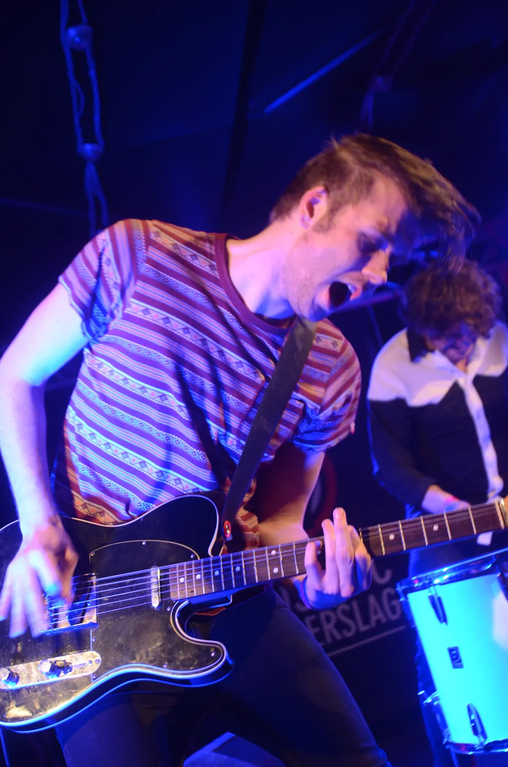 "Een-twee-drie-vier!" Even aftikken en we gaan weer verder met het geïmproviseerde drumstel van niet meer dan een snare, een tom, plus een hi-hat. De rest werd gisteren waarschijnlijk verloren in een weiland, net als de basgitaar. Dan maar met twee gitaren, dat klinkt toch prima? Traumahelikopter speelt een ode aan Jay Reatard en een cover van de een of andere obscure New Yorkse band. De inspiratiebronnen van Traumahelikopter zijn vaak slechts bekend bij een handvol hardcore liefhebbers.
