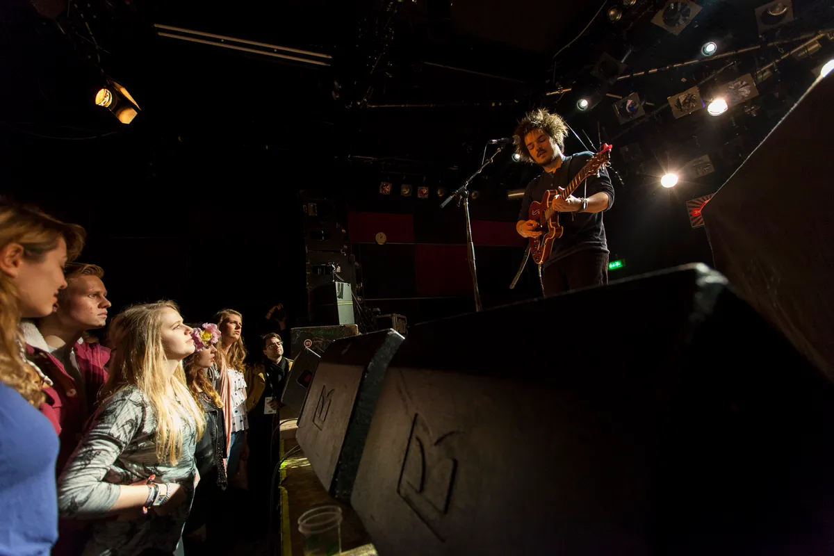 Het is ongekend wat een ingrijpende geslachtsverandering het publiek heeft ondergaan in een half uur tijd. Stonden er bij Royal Blood nog vrijwel uitsluitend headbangende mannen, als Milky Chance aantreedt zijn zij vervangen door uitbundig dansende hipstermeisjes. Tussen de nummers door mompelt de verlegen Rehbein wat onverstaanbare dingen in de microfoon, die desondanks met luid gegil begroet worden. Zelfs Vera-programmeur Peter Weening loopt nog even het podium op om Rehbein een hart onder de riem te steken. Het voornaamste resultaat is dat die laatste zich kapot schrikt. Als je al zo’n buzz hebt weten te creëren, dan moet zo’n showcase ook wel goedkomen.