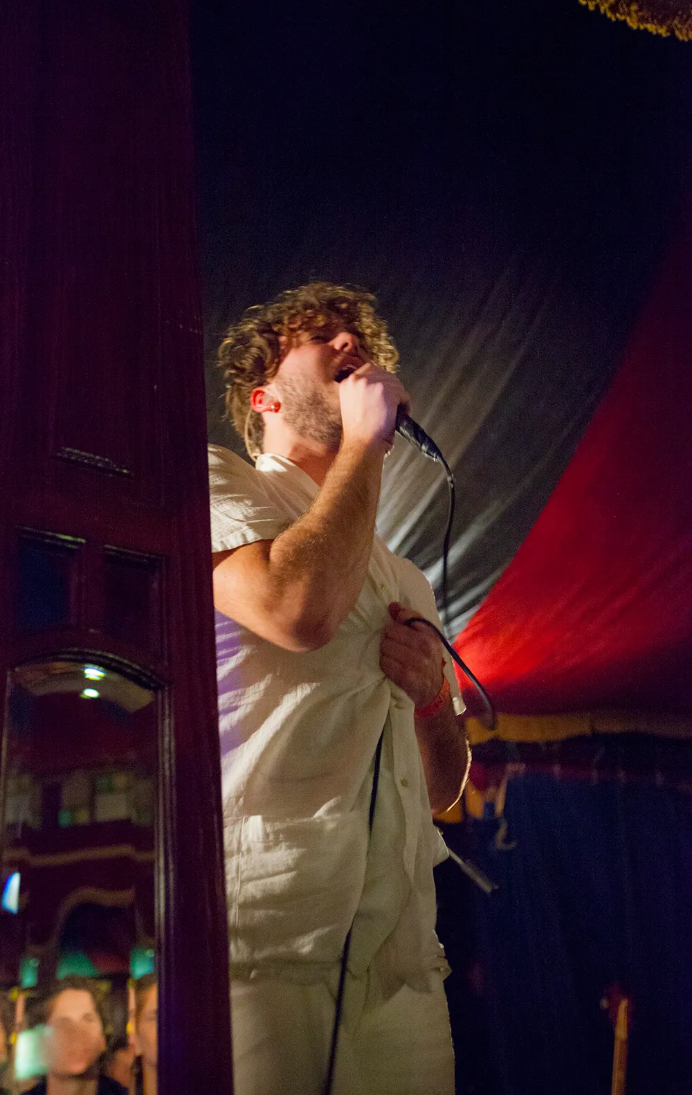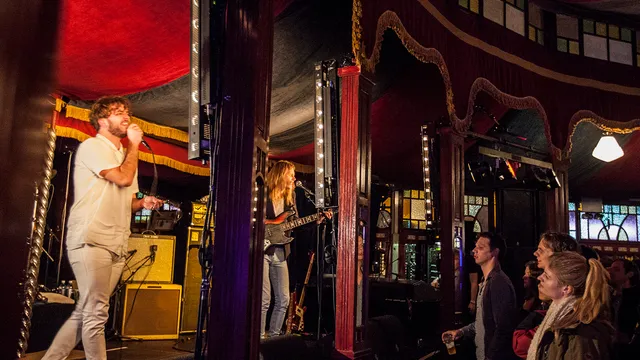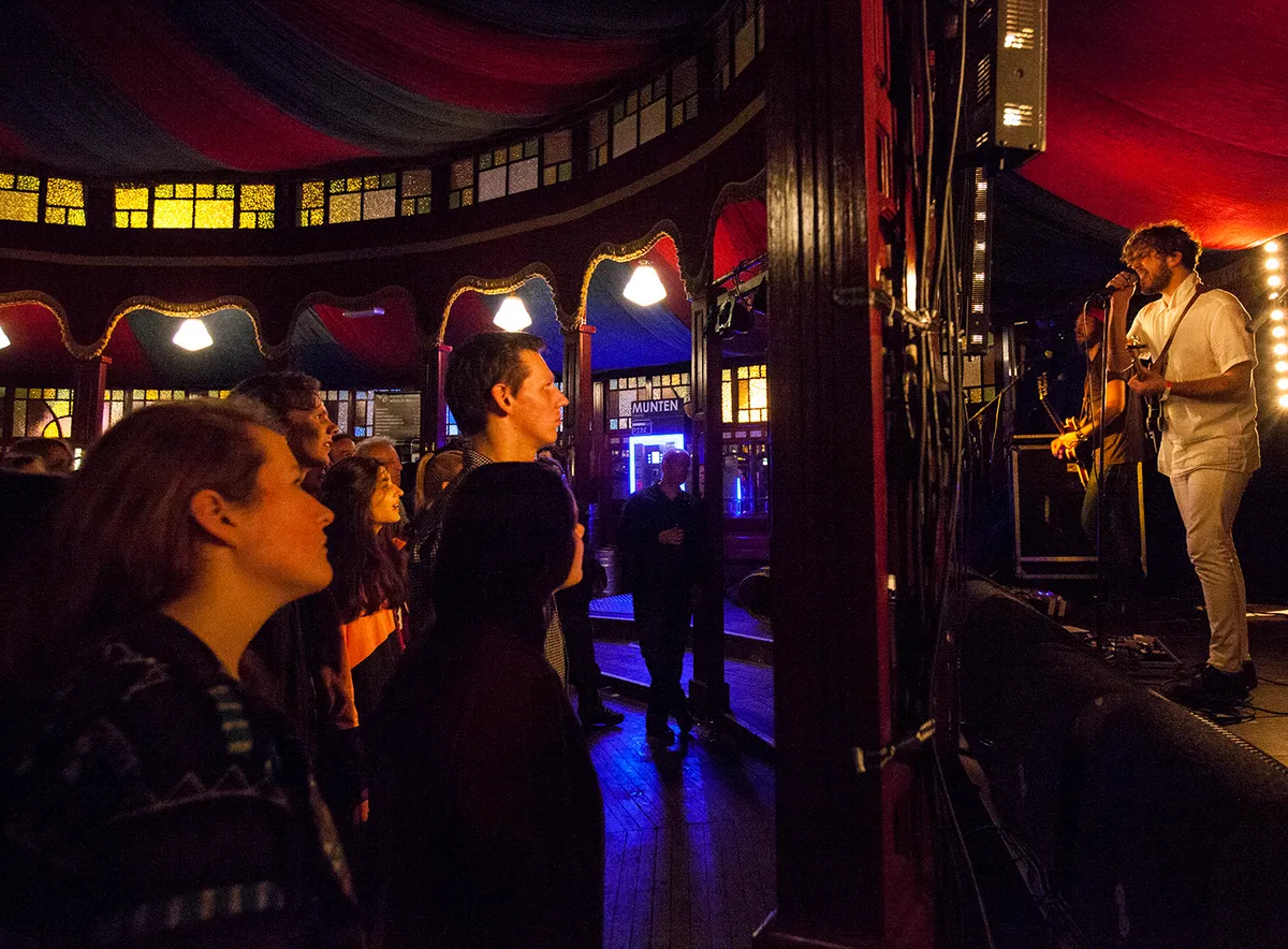 De nieuwe Moulin Rouge/Spiegeltent is halfvol gelopen met een mannetje of 120, een mengeling van de trouwe fans en geïnteresseerde industiemensen. De laatste achteraan en de volgelingen op de vloer, vooral springend op de grote hits Beam Me Up en So Electric.