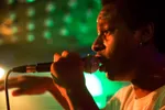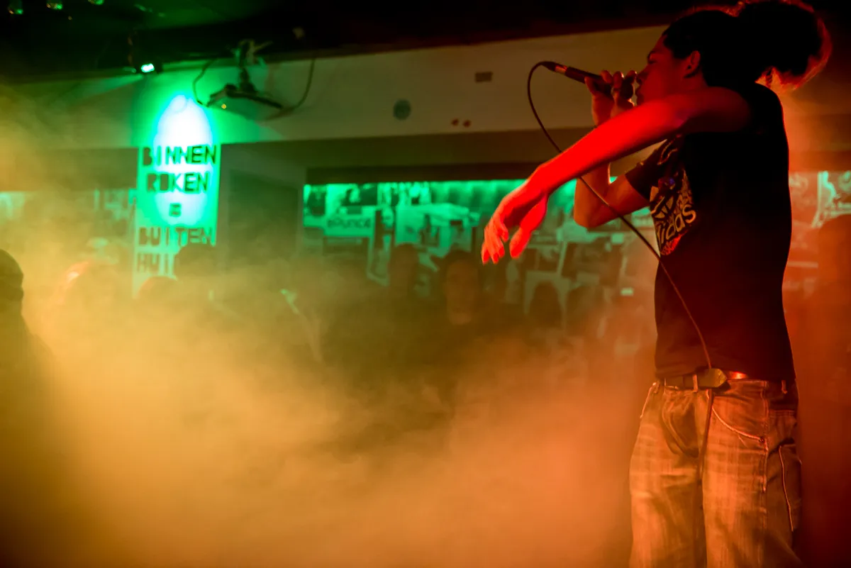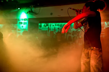 Na twee van zulke kanjers is Roberto Tan een beetje een afknapper. De zaal is al wat leeg gestroomd. Toch weet deze rapper 'van de koude grond' nog wat handjes in de lucht te krijgen. Een biertje krijgt hij niet, desgevraagd, noch van publiek noch van de barman. 'Zijn we toch weer voor nop aan 't optreden.' Zelfspot heeft hij dan weer wel.