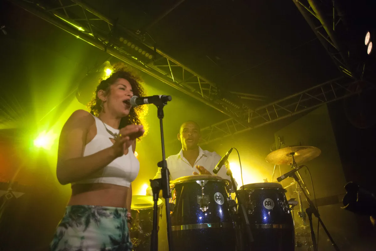 Een pompende elektronische basis - Caribische dancehall voert de boventoon, maar ook good ol’ dubstep komt voorbij - afgetopt met geweldig opzwepende live percussie en vocalen: tropical bass uit onze eigen hoofdstad! Het mag dan zo zijn dat Groningers bekend staan als bovengemiddeld stug, daar is vanavond in Simplon niks van te merken. Vanaf de eerste klanken gaat het los in de zaal. Maar écht los.