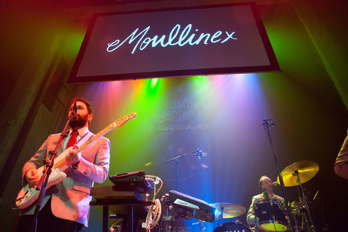 “Ja, het is moeilijke muziek. Met dingen als Disco en New Wave.” De presentator heeft het maar moeilijk met Moullinex, die het een paar tellen later allemaal haarfijn uitlegt: “It’s just music to dance to.” Een half jaar geleden kwam de Portugees Luis Clara Gomes in Nederland pas echt voor het eerst op de muzikale radar, met een fijne remix die hij maakte van Röyksopp & Robyn’s Again. Een remix ja, want ondanks de drie man sterke liveband die vandaag het Grand Theatre laat dansen, is Moullinex een producer en DJ. Voor de liefhebber: zijn Boilerroom set van vorig jaar is zeer de moeite waard.