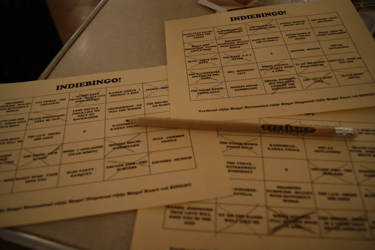 Een terugkerend festival kan niet zonder vaste programma-onderdelen. Al jaren organiseert pop-upstore For The Time Being een IndieBingo. Zo zit een man of vijftig vrijdagavond geconcentreerd met potlood, papier en een biertje vakjes af te kruisen...