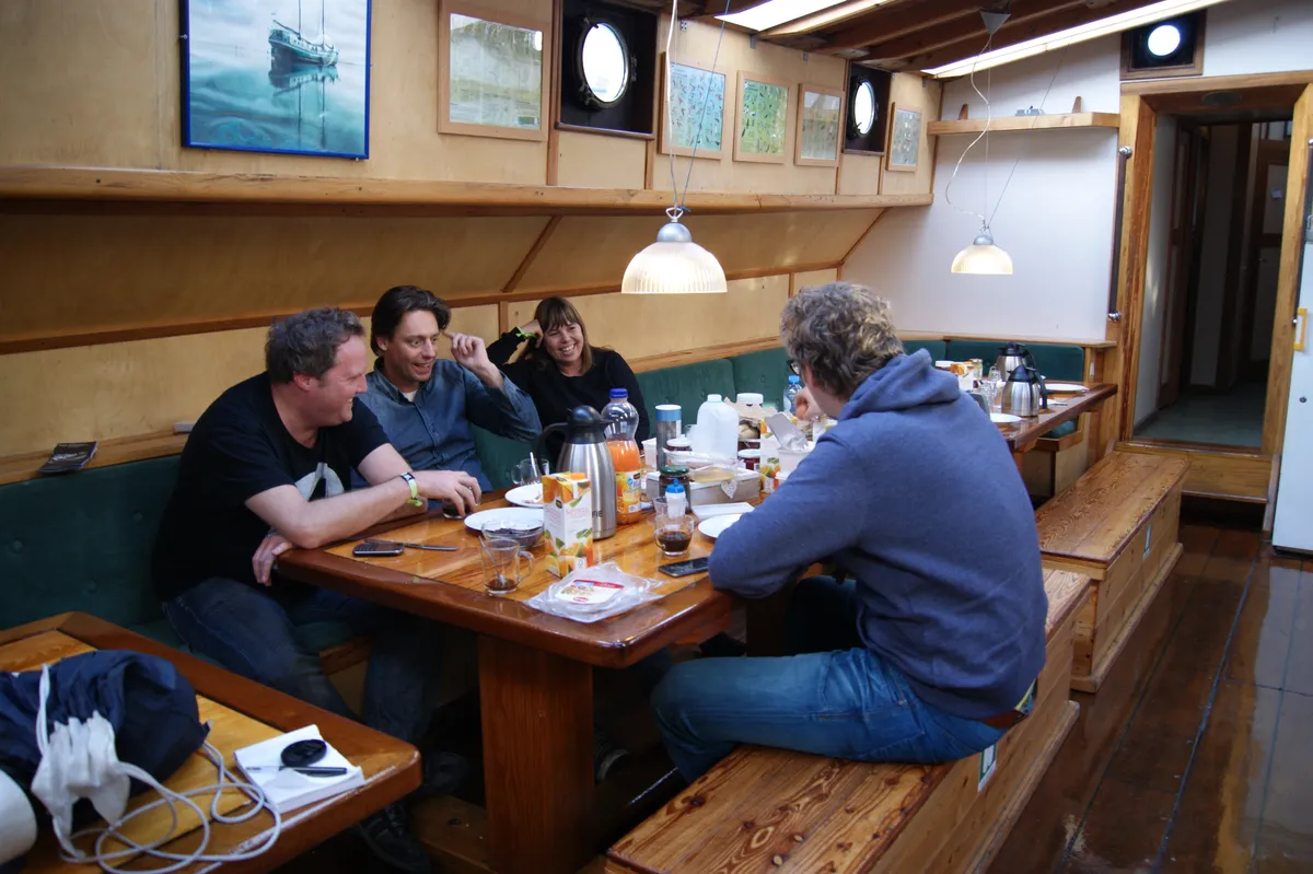 Het schip waar ze zitten, biedt onderdak aan ongeveer vijfentwintig gasten. Het lijkt misschien een wat benauwde kleine omgeving voor zo'n aantal. 'Maar als de andere gasten slapen of richting stad zijn vertrokken, heb je echt geen enkele reden om hier de huiselijke sfeer te verlaten en met je kater in de kou te gaan staan.'
