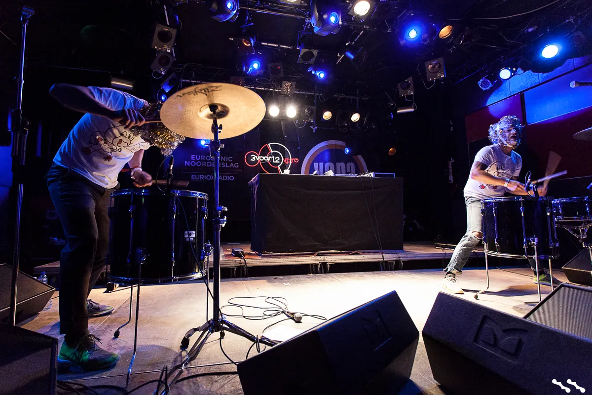 Gezichten wit geschminkt, bandshirtje aan en een meter of twee aan gouden kerstslingers om het hoofd geknoopt. Ninos Du Brasil heeft er werk van gemaakt. Het tweetal staat elk op een hoek van het podium. Elk met microfoon, om zo nu en dan iets door te kunnen schreeuwen. Elk met kleine drumkit om non-stop op te rossen. Safri Duo meets Slagerij van Kampen meets een hele berg speed. Niet dat ze met die trommels van ze alle herrie maken die we horen, er loopt ook een opname mee met daarin nog meer percussie. (RHH)
