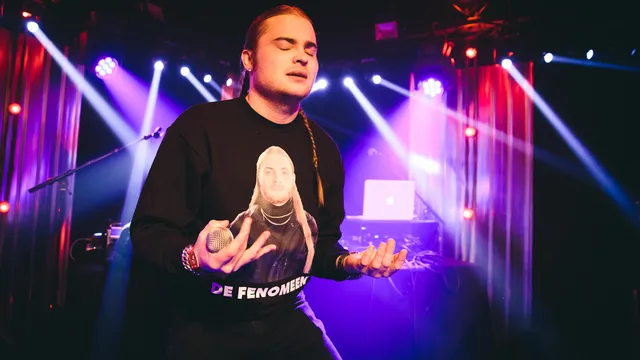 Maradonnie. De brakka van Balmain. Young Kermit. Wubbo Ockels. De mannelijke Anna Drijver. Leipe van het plein. De Nederlander Post Malone met een missend chromosoom. De Amsterdamse cultheld Donnie kent vele roepnamen. Op zijn behoorlijk geniale trui vanavond staat groot De Fenomeen, nog zo’n goeie. Hij viel als protegé van Vjèze Fur al op met de tape Leipie van het Plein uit 2014 en het album Mannelogie (2015), beiden vol synthfunkbeats van Bas Bron. Afgelopen jaar volgde de wat slechtere mixtape Loei Ordinair. Hij maakt zijn vele namen redelijk waar: hij masseert de gitarist/toetsenist (‘de blanke Bas Bron’) wanneer die een viezige solo speelt, gooit water over het publiek heen en vibet vooral heel lekker.