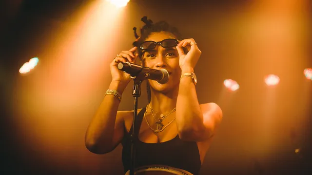 ‘Mag het licht even roze voor dit liedje?’ ‘Ik zat aan diep blauw te denken…?’ ‘Misschien een spotje?’ Heb je ooit een artiest gezien die zich telkens zo bemoeit met het lichtplan? Rapper IAMDDB uit Manchester wel, hoor. Ze maakt moderne trap en R&B met af en toe een lekker jazzy uithaaltje, soms zo hees en diep rappend als Young M.A., dan weer meer richting zangerige R&B. En wat blijkt? Ze heeft een extreem leuke uitstraling: ze springt al vijf minuten te vroeg op het podium en maakt tussendoor gezellige praatjes. Over het feit dat ze haar riem is vergeten, bijvoorbeeld, en dat is best onhandig met zo’n baggy legerbroek. Over het feit dat ze single is en op zoek naar pussy. Dat we allemaal een jointje nodig hebben. ‘Wat, blowen jullie niet?!’ Ze zingt en rapt bovendien alles live, waar veel Amerikaanse collegae dat liever aan backing track en autotune overlaten.