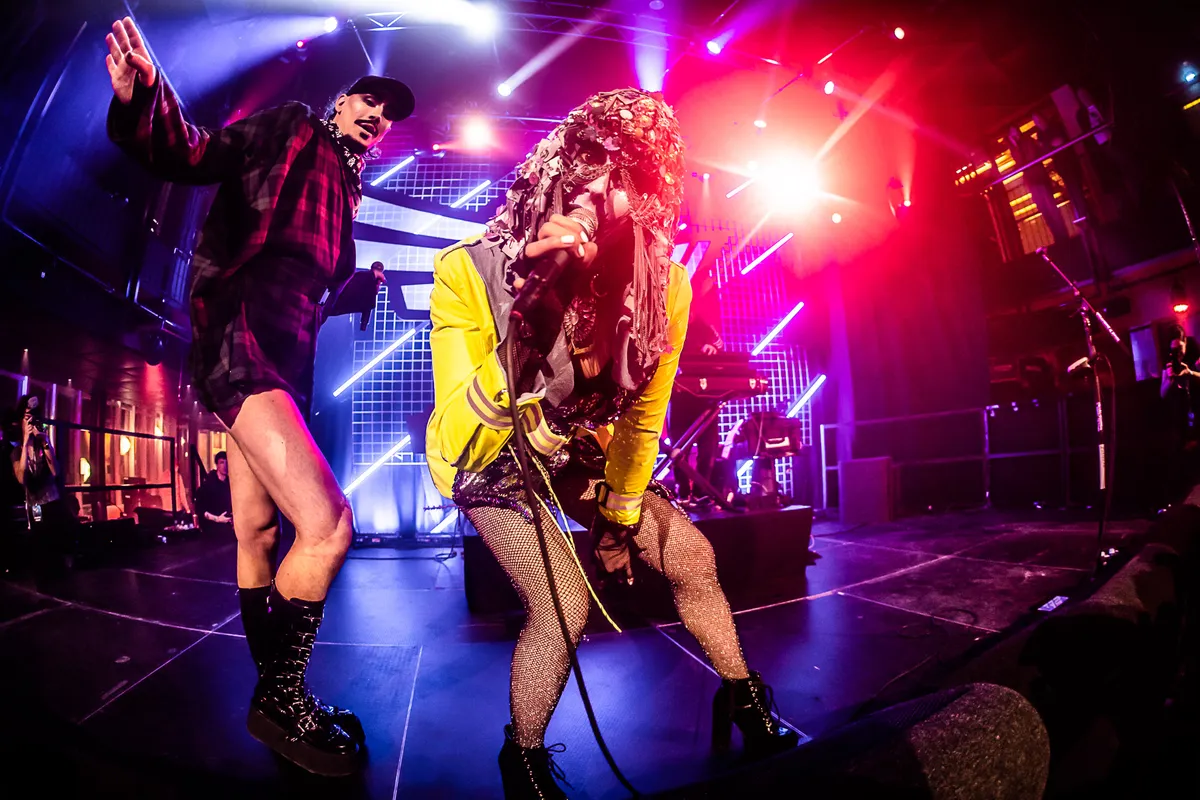 Hoe zit het nou met Fata Boom? Voorop het podium staan een geschminkte zangeres met een soort stoffen pruik en een zanger in een overhemd en een string. Achter staat een gast in een trainingspak als een malle alle beats te triggeren. En dan heb je nog achter de schermen indie bandproducer Martijn Groeneveld, die de liedjes schrijft en naar het schijnt het geluid voor een groot deel bepaalt. Maar hij heeft geen zin om op het podium te staan, en dus zien we die andere drie. Ze staan in de entreehal, misschien wel de meest ongelukkige plek van Groningen. Menig veelbelovende act is daar gesneuveld, omdat je vol in de tocht van de uitgang staat en in het gedrang van de garderobe.