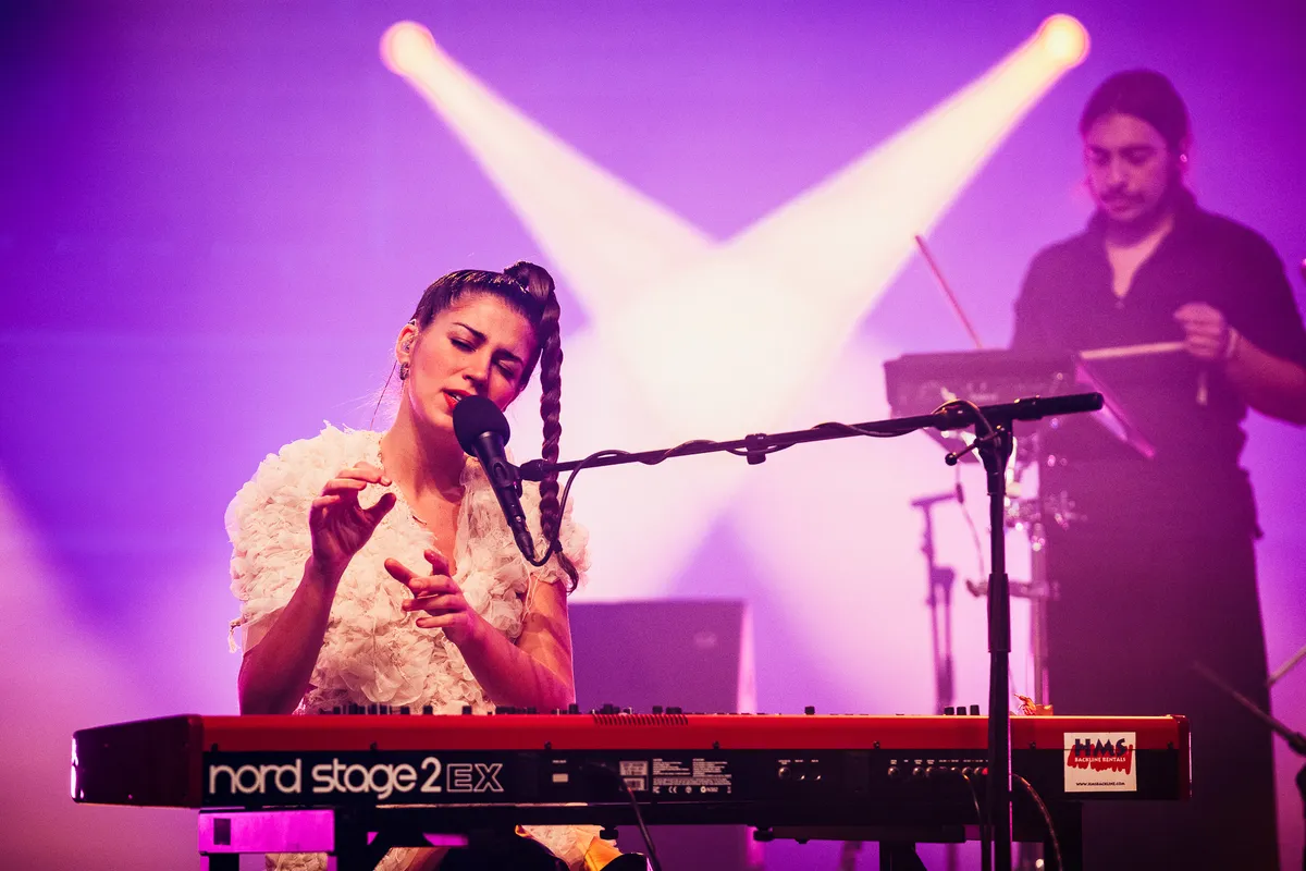 'Tadiedadiem. Dum. Dum. Takiedadiem, duda, duda!' Nee, er is geen speld vast te knopen aan het zelfverzonnen taaltje waarin Marina Herlop haar piephoge melodietjes kirt. Eigenlijk is de pianist/componist een beetje een vreemde eend in de bijt op Eurosonic: ze bracht een schitterende, avant-gardistische plaat uit op de sweet spot tussen Rewire en Le Guess Who?, laat in haar composities klassieke piano-motieven botsen met vooruitstrevende elektronica en maakt met haar stem vocale salto's en pirouetjes in een grappig brabbeltaaltje. Het geeft haar muziek iets speels, dat malle verenjurkje en die guitige blik op haar gezicht doen de rest. Het maakt haar show toegankelijker dan je op basis van de plaat zou zeggen.