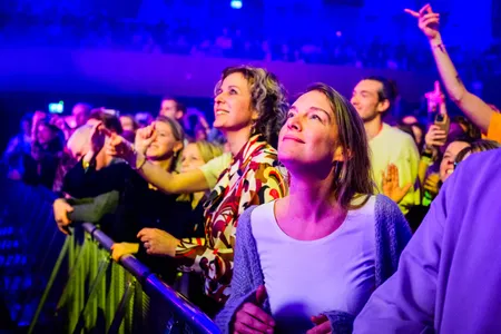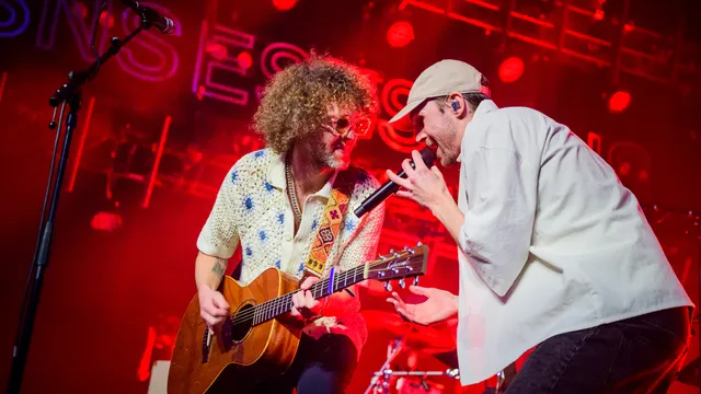 Die focus op het buitenland is wel te begrijpen, want lange Tienus bracht zijn dertiger jaren achter de schermen door als songwriter in LA, nadat hij zijn handtekening zette onder Kygo's miljardstreamer ‘Firestone’, een song die wereldwijd niet uit kledingzaken weg te slaan was. Hij zingt erover in ‘To Tomorrow’, de doorbraak van Goldkimono en zijn terugkeer in de spotlights. Van blowend skaterjoch naar gevierd schrijver, hij werd er zijn ‘beste zelf’ mee. Maar uiteindelijk is het vooral de gratis weelde van een zonnetje op je gezicht waar hij de electric swingende Oosterpoort van laat dromen. Aan zijn zijde staat mede-oud-Leaf lid (die met de krullen) Ocker Gevaerts, wiens grijns nog groter is dan zijn zonnebril. Zijn gitaarlicks zijn licht en feilloos, na een valse start met wat technische issues.