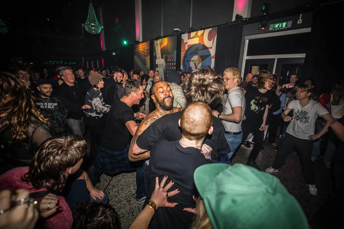 ‘IK BEN EEN ONSTABIEL PROJECTIEL!!!!!,’ schreeuwt Ray Fuego manisch in de microfoon tijdens ‘Rattekop’, het eerste liedje in de set van Ploegendienst. Geen enkel woord van gelogen, want de koning van de Bims IS een onstabiel projectiel. Eentje wiens manie perfect wordt ondersteund door een snoeiharde band, eentje waarbij je nooit de volgende stap kunt voorspellen – huh, gaat-ie nou opeens een gedicht voordragen?! En juist die onvoorspelbaarheid maakt dat iedereen in de foyer van de Oosterpoort kei- en keihard gaat voor Ploegendienst. Lekker boeien dat het hele feestje pas om kwart voor 12 ‘s avonds begint. Moshen moet!