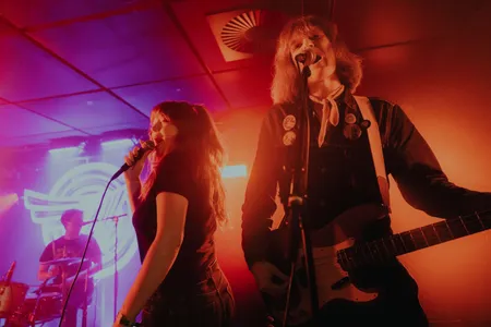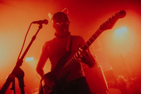 Een gast met een latex bivakmuts en een zacht kattenoortjesdiadeempje verschijnt voor ons: ‘Cue het intro maar.’ De speakers worden gevuld met ‘Rhinestone Cowboy’ - jawel, de klassieker van Glen Campbell - en voor een paar seconden vraagt het publiek zich af waar de fuck ze zijn beland. Is dit wel de Bovenzaal?