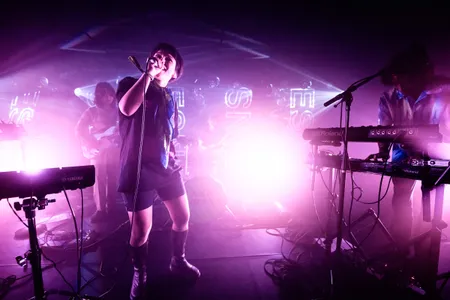 Inda Duran zweeft boven de synths met haar mystieke vocalen, alsof ze verhalen over verloren schatten fluistert, terwijl ze eigenlijk zingt over dumplings met hete sambal, roze auto’s en shoppen. Naast haar staat Marnix Wilmink, die de show in beweging zet. Zijn synthesizers krijsen, glinsteren en voegen dubby, spookachtige lagen toe, en af en toe vervormt hij zijn stem tot mysterieuze, jazzy geluiden. Samen spelen ze met mysterie en alledaagse humor: Inda’s bezwerende zang drijft de sfeer, terwijl Marnix met ritmische tikjes op drumpads en knallende synths de groove leidt en het publiek zachtjes laat wiegen of los laat gaan.