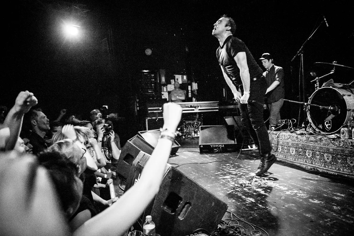 Samuel Herring ziet er doodnormaal uit, in zijn zwarte, hoogsluitende shirt, zwarte broek en zwarte schoenen, maar als hij zingt laat hij zijn lichaam diep golvend bewegen. Hij zwenkt zijn heupen alsof ie Elvis zelf is, croont als een Morrissey in grootse vorm, werpt af en toe een Tom Waits monstergrom tussendoor. Hij slaat zichzelf op de borst en hij zoekt de twinkeling in de ogen van de meisjes op de eerste rij alsof hij de knapste Spanjaard aan de costa is. Het is op het randje van awkward en regelmatig er ver overheen: aan de ene kant oprecht aanstekelijk, aan de andere kant het type sensueel dansje dat je als dame toch liever niet in je slaapkamer wenst.