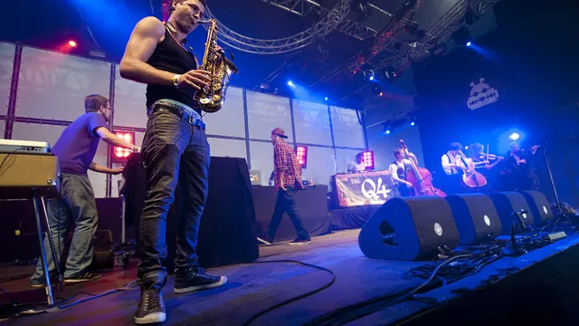 De nadruk ligt te veel op gastzangers en -rappers, en dat zorgt voor te veel pauze tussen de nummers. Voor 'Oscuros Angeles' komt de Spaanstalige zangeres Curra Suarez het podium op, als ze klaar is bedankt ze het publiek en de band, en gaat ze weer. Dan komt MC BLS op, die ook weer even zijn momentje intro moet pakken ('How you doing?'). Voor de muziek van The Q4, die het toch vooral moet hebben van de sfeer en de flow tussen de nummers, is dat funest. Net als er een beetje vaart inkomt, is er weer een halve minuut stilte. Dieptepunt in dat opzicht is de fake-opkomst van soulzanger Terryman: hij komt het podium op, maant het publiek hem toe te juichen, is ontevreden met het resultaat en vertrekt weer. Maar niemand kent die man ook! De band start maar even een ander nummer in.