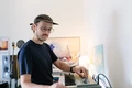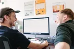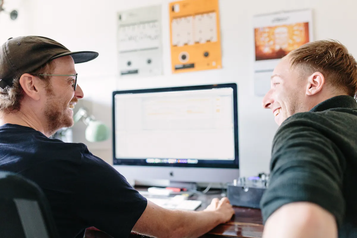 Dan duwt Max me een gitaar in handen. ‘Hier’, zegt ie. ‘Deze noot moet je vasthouden. En dan moet je met je voet dit pedaal in trappen, heel langzaam, tot de drop komt.’ Fuck me, ik speel gitaar. Wat een onding is dat eigenlijk, met die kutsnaren. Die drumcomputer beviel me wel, maar een gitaar in mijn handen voelt als een huilende baby van iemand anders. Mag ik hem al weer teruggeven? Toch zit mijn ambachtelijke bijdrage wel degelijk in het eindresultaat. De timing is balabberd, het klinkt een beeeetje valsig ook, maar ergens is dat juist wel leuk. Voor mijn gevoel werkt het wel. We houden het er in. Zijn we er dan? Max wil er dolgraag nog een soort ’swoosh’ onder plakken uit zijn sound library. Hij trekt allerlei lasergeluidjes en opstijgende ruimteschepen tevoorschijn, de een nog cornier dan de ander. En toch, precies onder mijn heroïsche gitaarsolo, in de piek van de break, en subtiel weg gestopt in de mix, is het toch een zinnig element in het geheel.